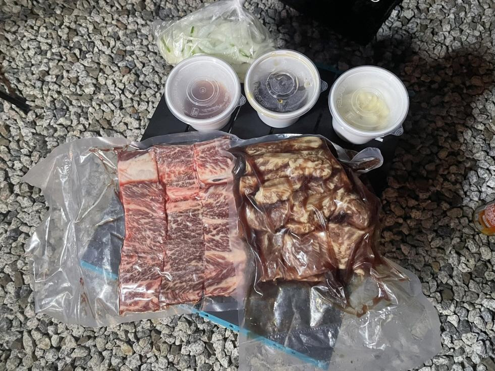 저녁에 먹으려고 했던 이동갈비를 바로 구웠어요. 포천에 왔으니 이동갈비와 이동막걸리를 먹어야 겠죠? 이곳 각흘 캠핑장으로 오는 길에 이동 갈빗집과 이동 막걸리집이 많아요. 오면서 포장해왔어요.