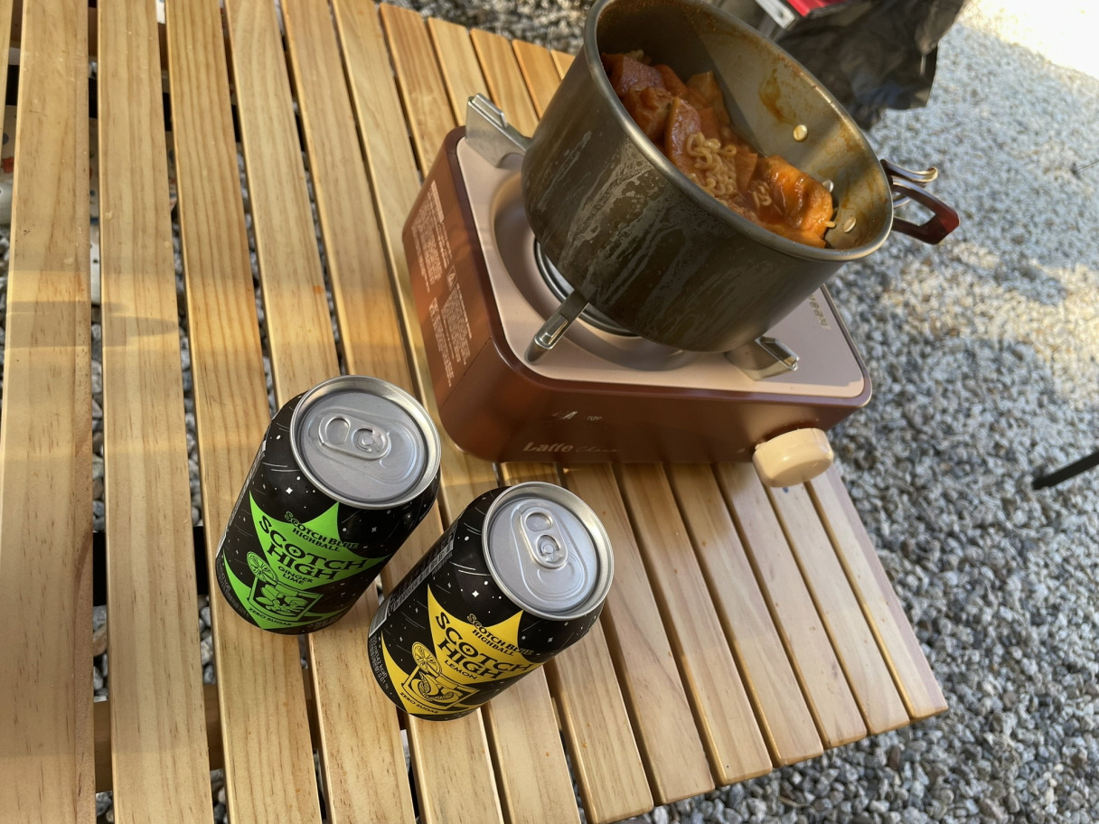 타프만 치고 힘드니까 간식 먹고 나머지 셋팅을 합니다. 이때쯤 이면 가장 맛있는 것이 캔맥주예요. 저희도 요즘은 맥주대신 하이볼이 맛있더라고요. 피코크에서 나오는 신당동식 떡볶이와 스카치 하이볼 한 캔 합니다. (아래 링크)