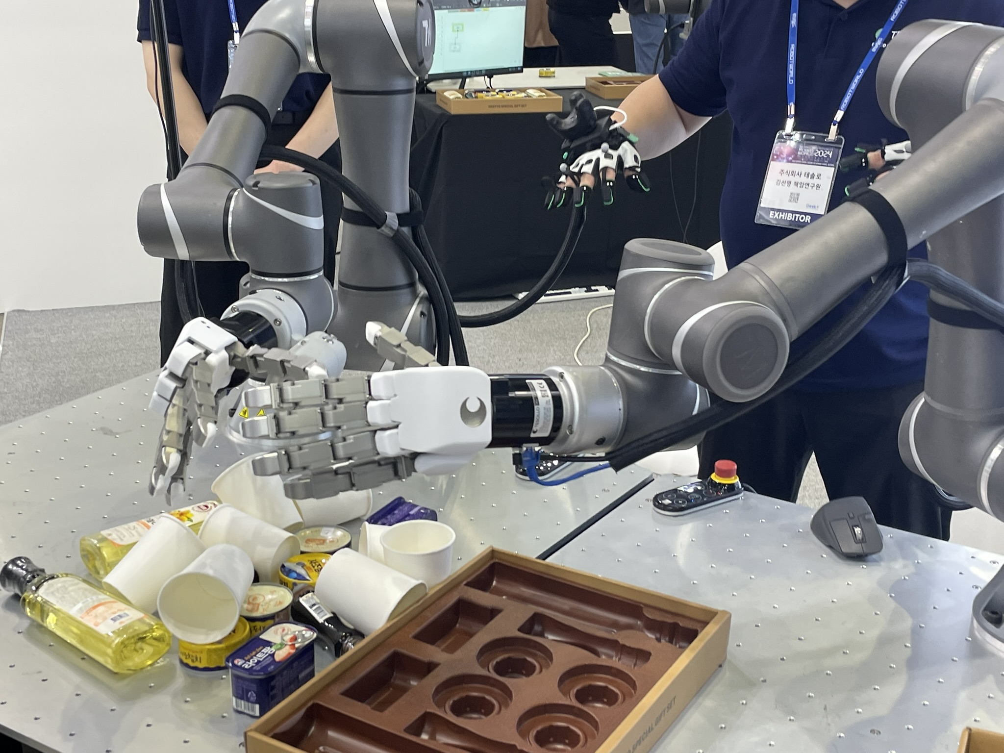 로봇뒤에서 사람이 로봇을 조종하는 장갑을 착용하고 사람이 움직이는 대로 로봇팔이 똑같이 움식입니다.