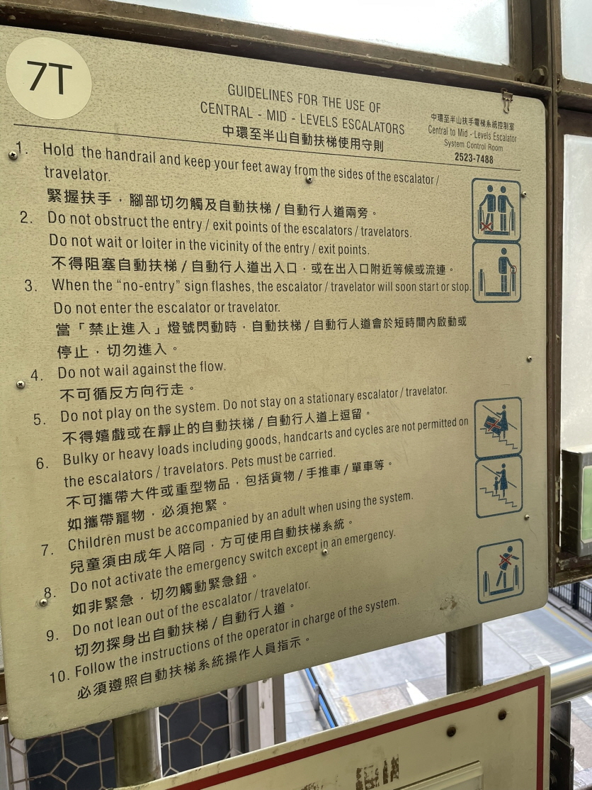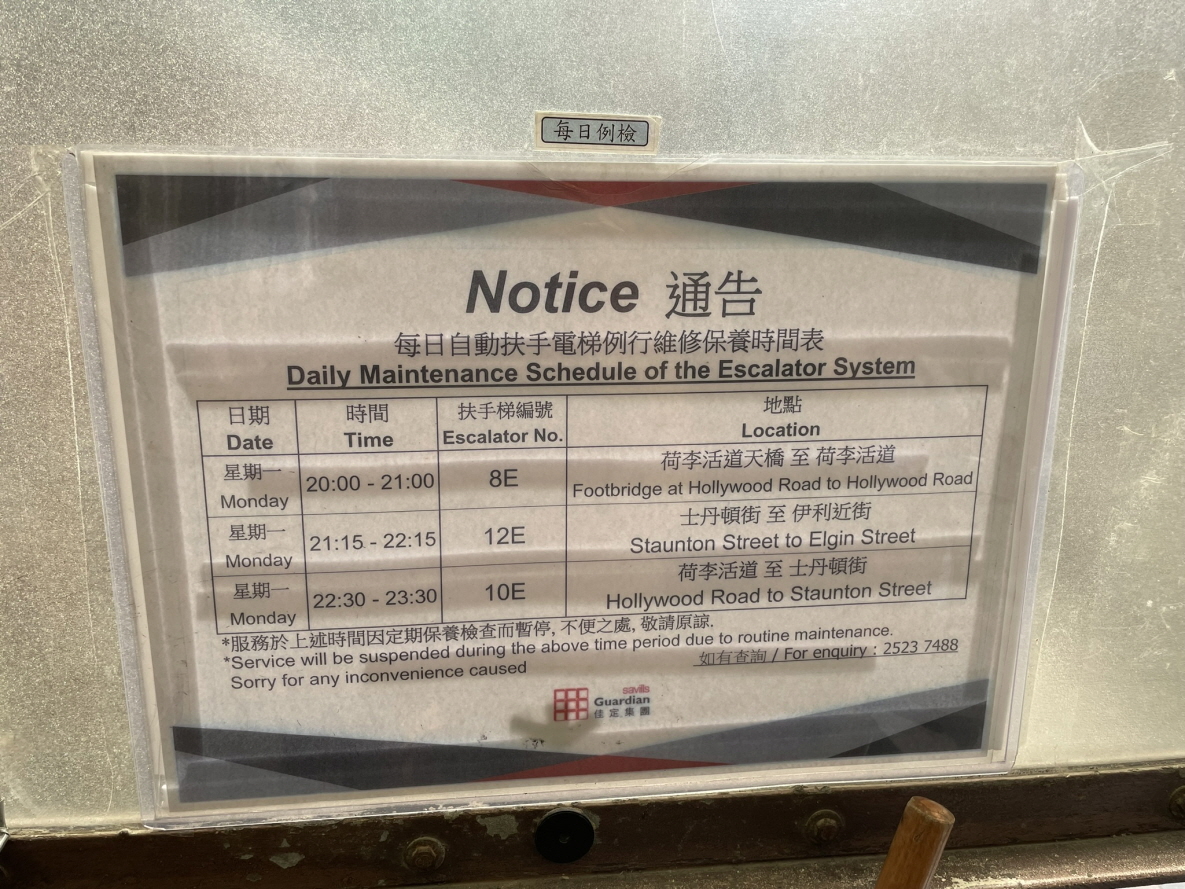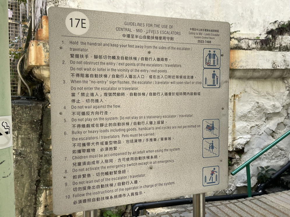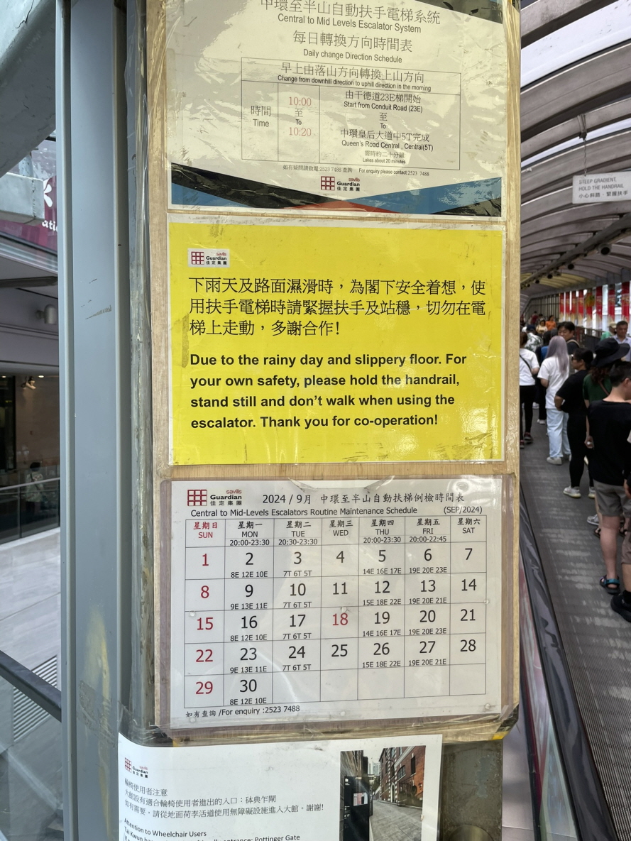 에스컬레이터의 방향은 시간대에 따라 달라집니다. 아침에는 사람들이 센트럴 지역으로 출근할 수 있도록 아래쪽(센트럴 방향)으로 운행하고, 오전 10시부터는 위쪽(미드레벨 방향)으로 방향이 전환되어 저녁까지 계속됩니다. 이 구조는 출퇴근 시간을 고려하여 설계되었어요.