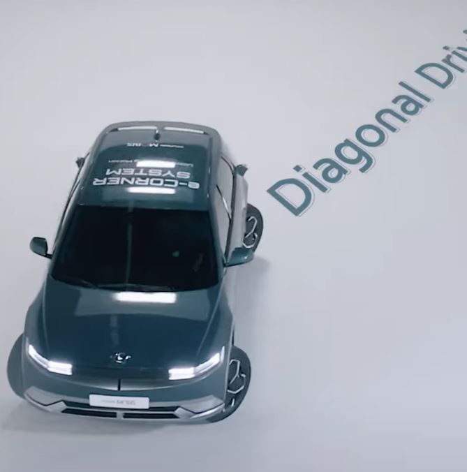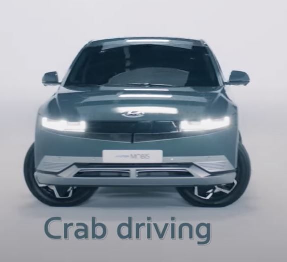게가 옆으로 걷는 듯한 모양으로 자동차의 4개 바퀴가 90도로 꺾여서 평행으로 이동하는 구동입니다. 바퀴의 구동 모터가 바퀴 속으로 들어가서 가능한 기능입니다.