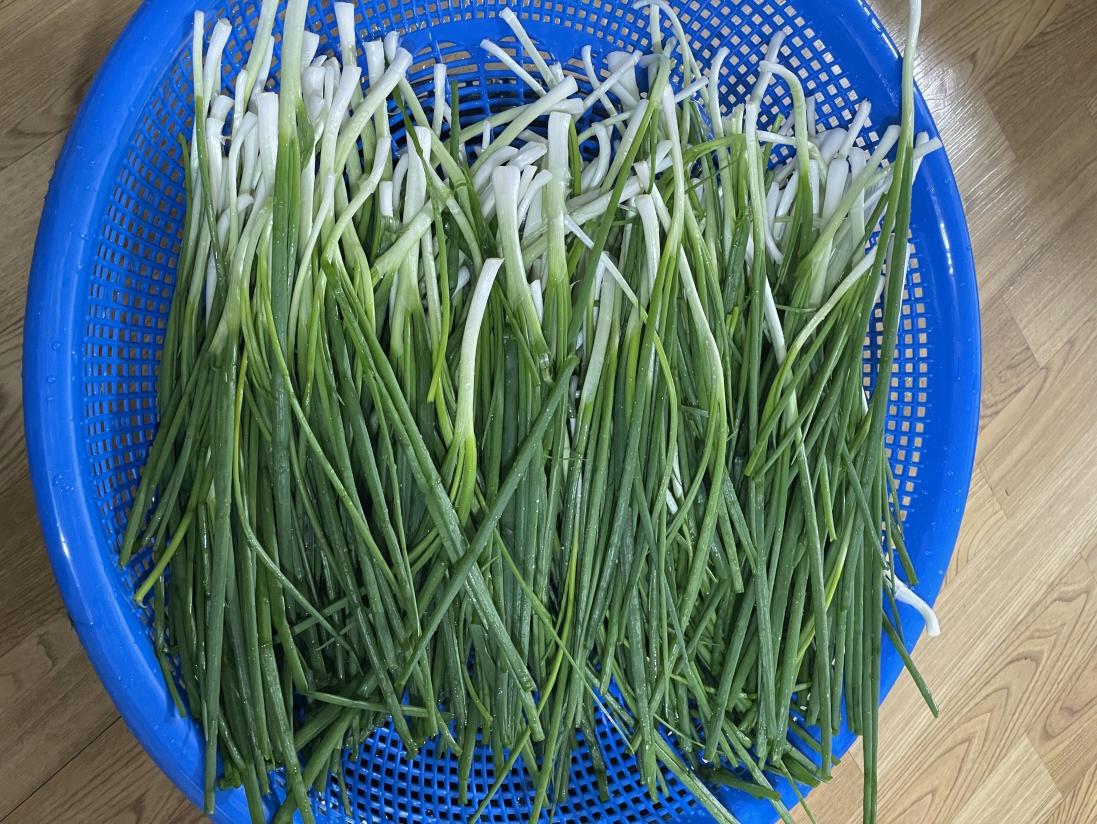 1 쪽파를 먼저 손질합니다. 뿌리를 잘라내고, 끝단에 상한 부분은 잘라냅니다.