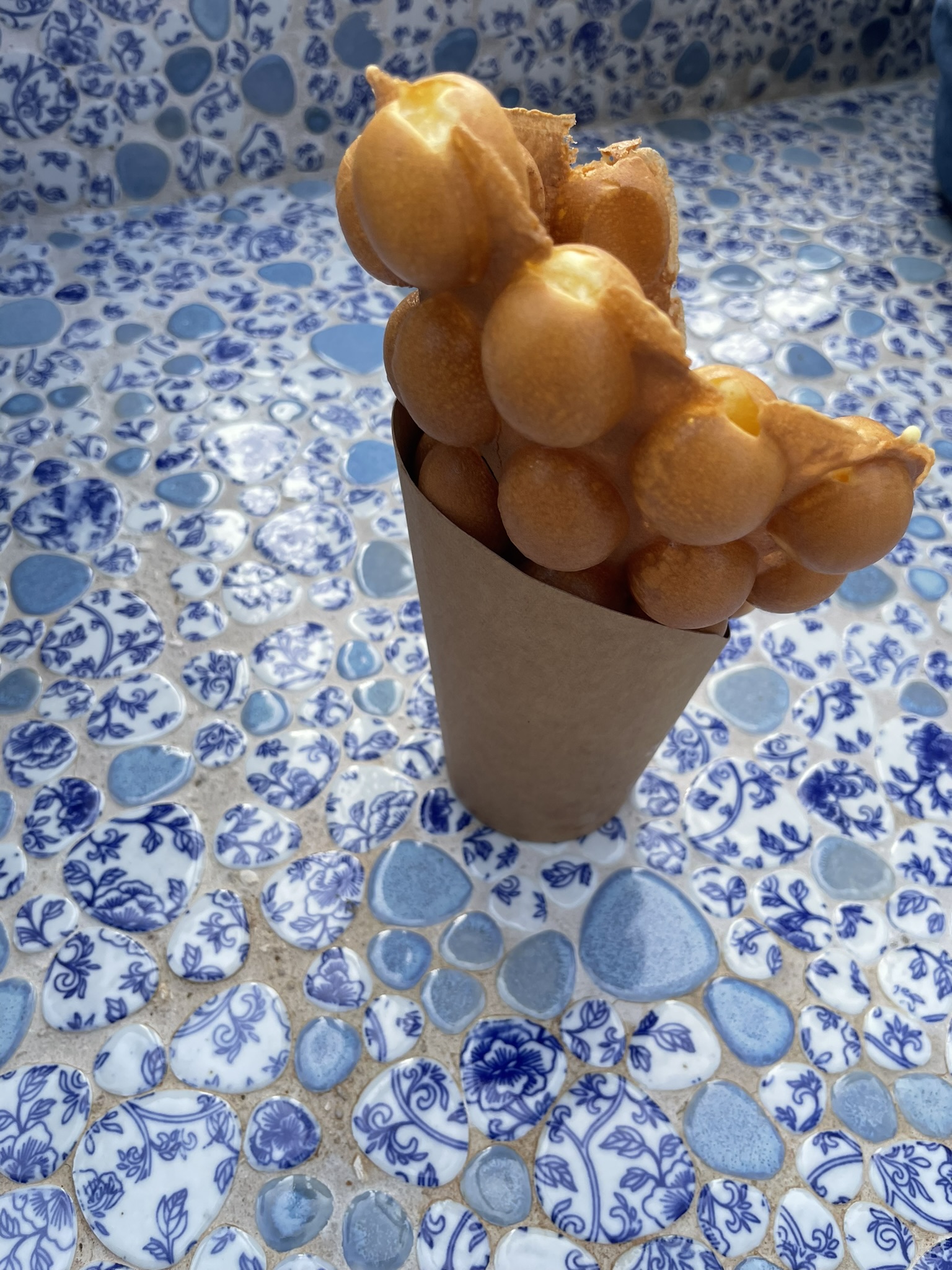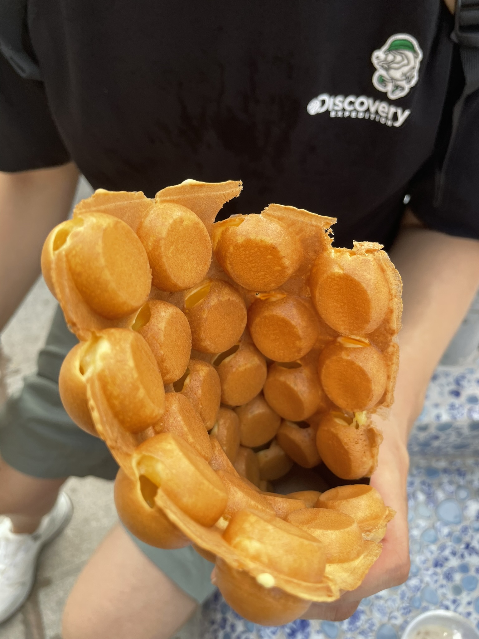 홍콩에그와플이라는 빵이에요. 타이파 빌리지에는 이런 홍콩에그와플도 많이 팔아요. 맛은 생긴 것만 봐도 알 수 있을 것 같은, 생각했던 그대로예요. 와플빵을 부풀려 놓은 그런 맛.