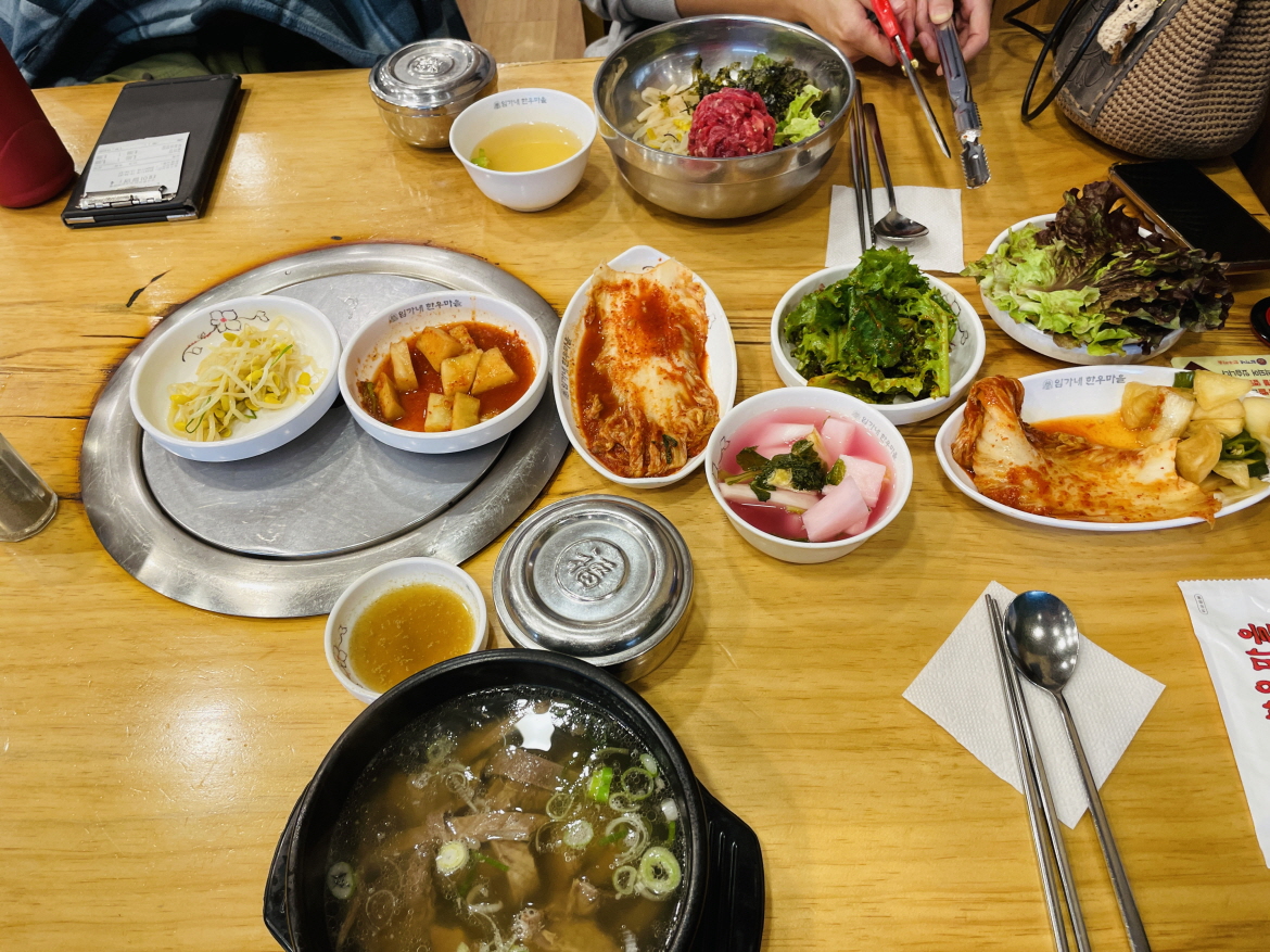 반찬도 모두 셀프 리필이고요 맛있어요. 쌀과 김치도 국내산이고 모든 소고기는 국내산 한우입니다. 그런데도 식사 메뉴는 8천 원 밖에 안 해요. 믿고 먹는 맛집이네요. 추천합니다.