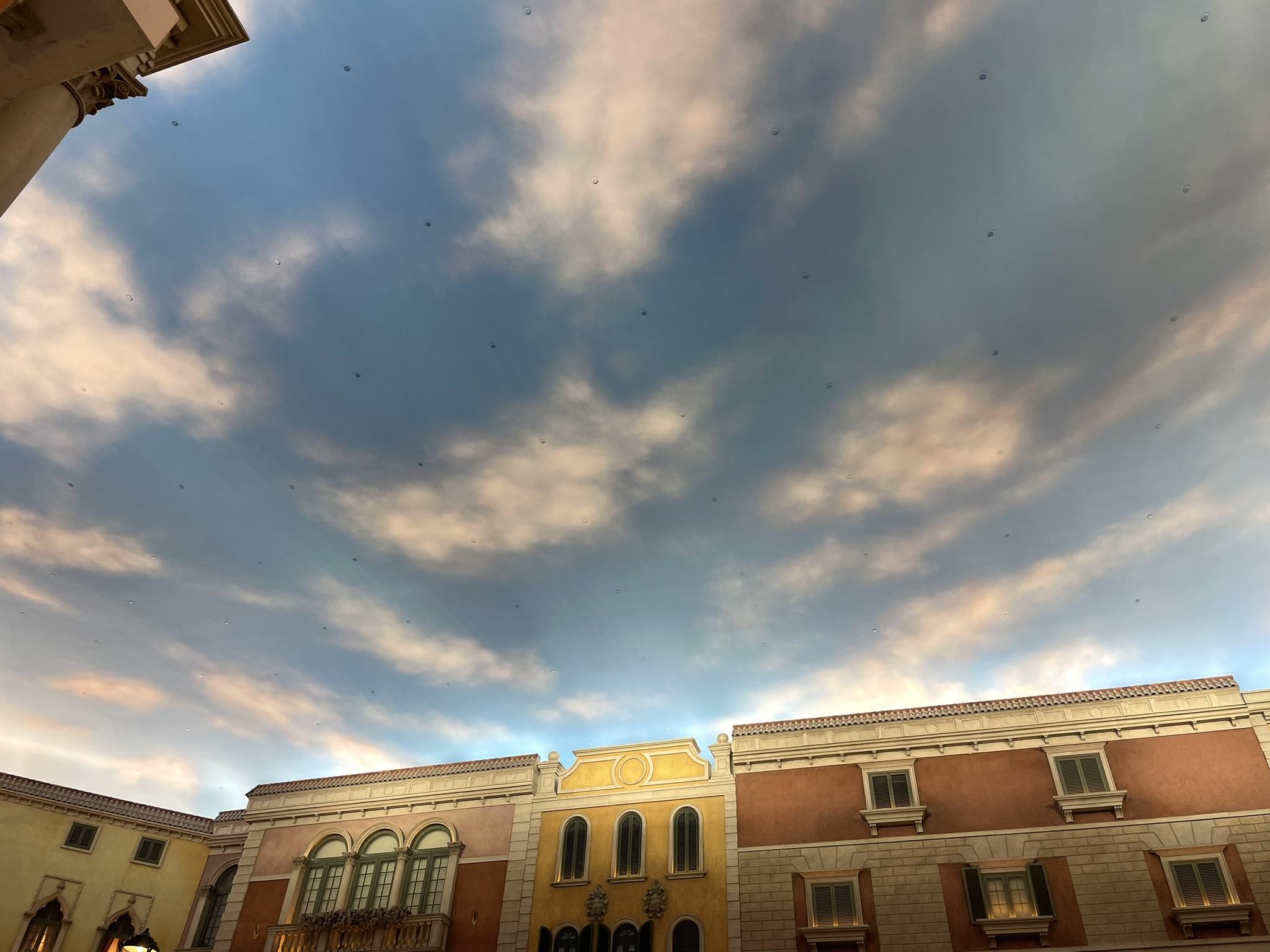 베네시안 리조트에 있는 푸드코트도 사람들이 많이 찾는 식당가입니다. 실내 시설이지만 하늘을 올려다보면 정말 하늘인 줄 알고 속았어요. 파란 하늘과 구름이 있는 그림입니다. 아이디어 좋네요.
