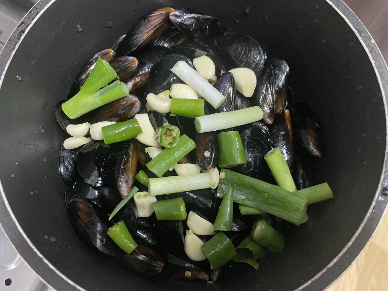 국물이 끓으면 홍합이 입을 열어요. 10초만 더 끓인 다음 불을 끄면 됩니다.