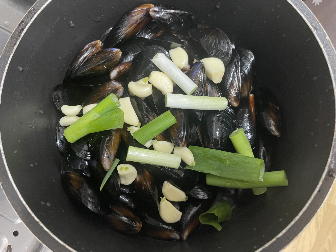 홍합에 물을 붓고 끓입니다.