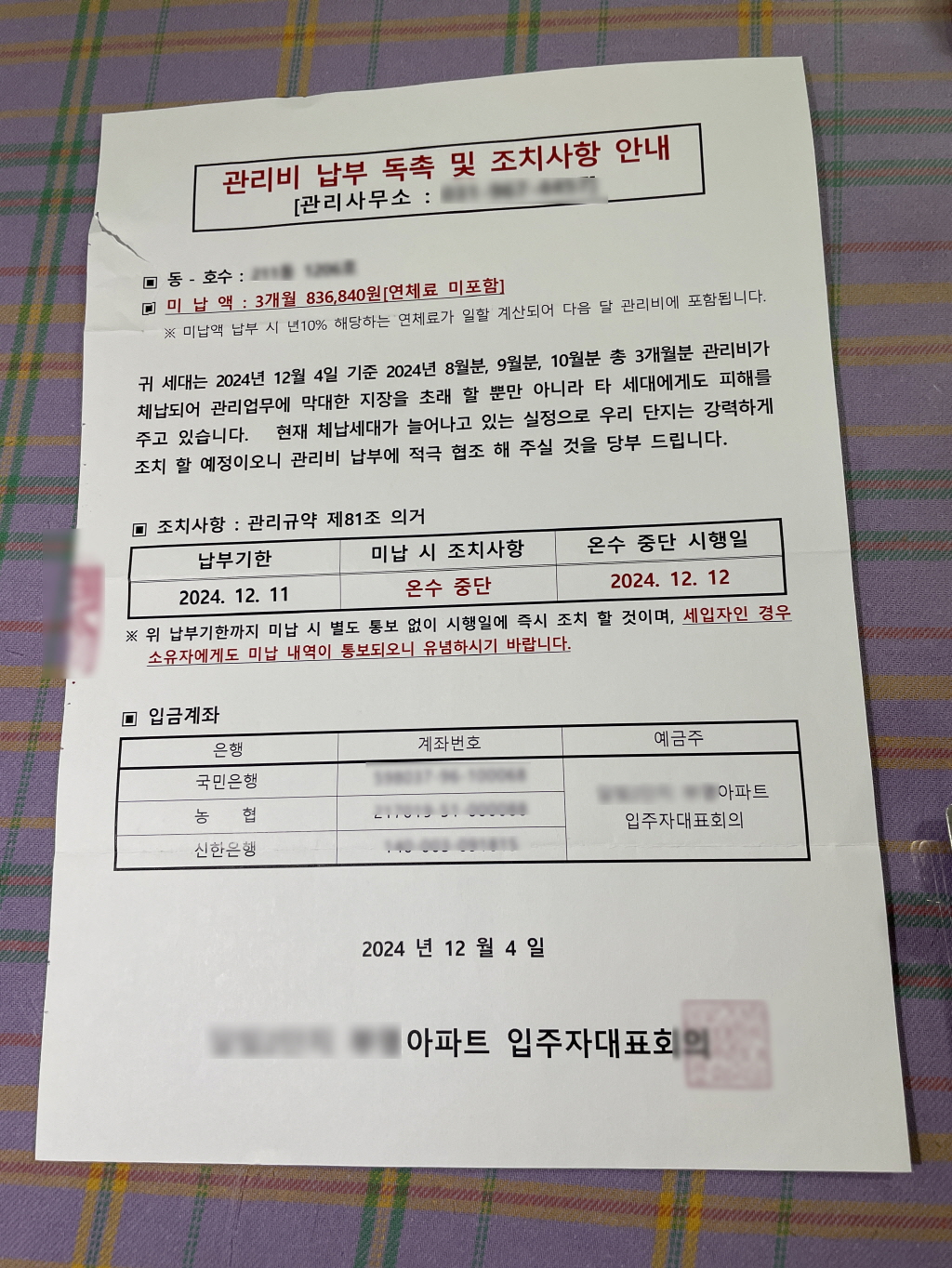 모두 새 카드로 다시 설정했는 줄 알고 신경 안 쓰고 있었는데 아파트 관리비가 2개월 넘게 미납되었던 거예요. 이건 미납됐다고 문자도 안 와서 모르고 있다가 우편함에 편지가 하나 와있어서 보니까 3개월 미납되었다는 통지를 받았습니다.