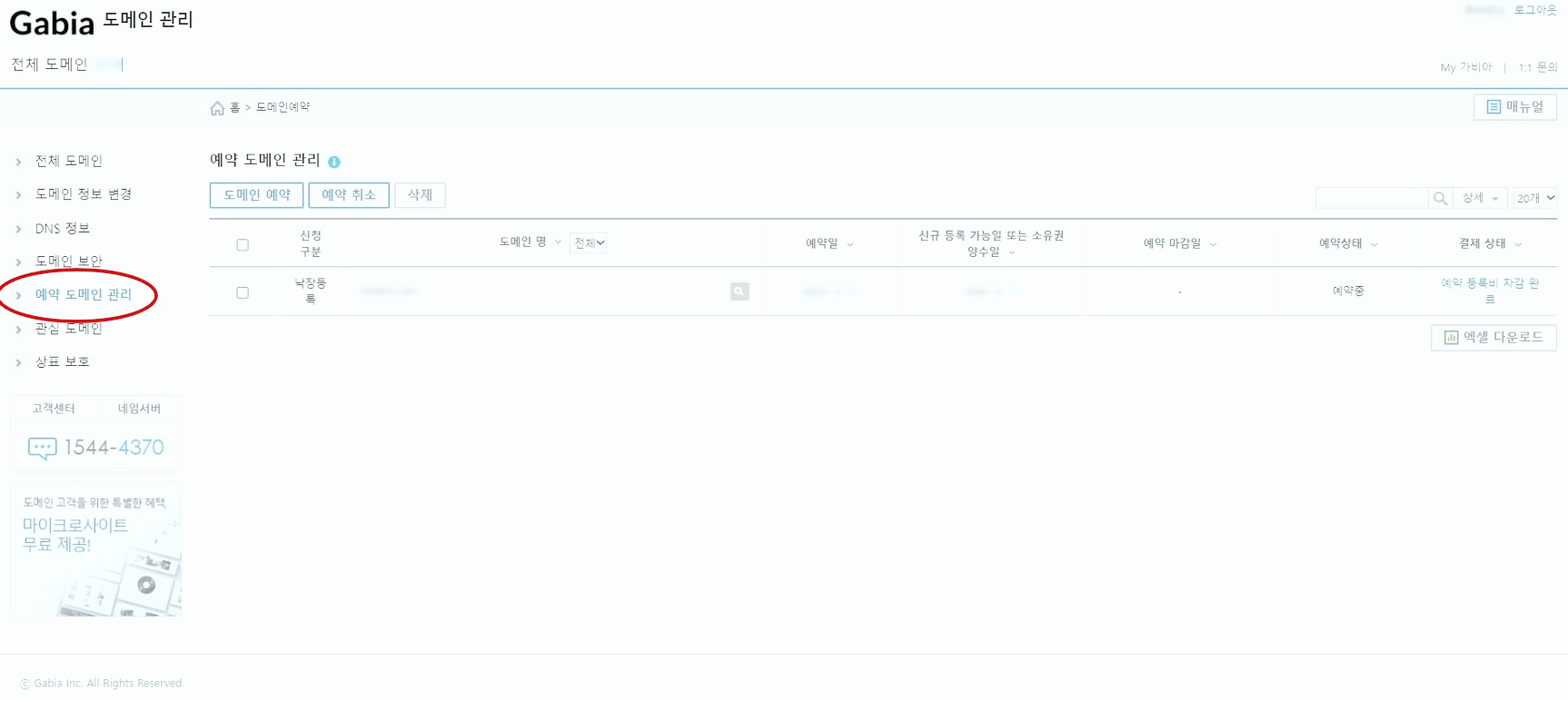 예약하여 구입한 도메인은 도메인관리 메뉴의 왼쪽 예약도메인관리 항목에서 확인 가능합니다.