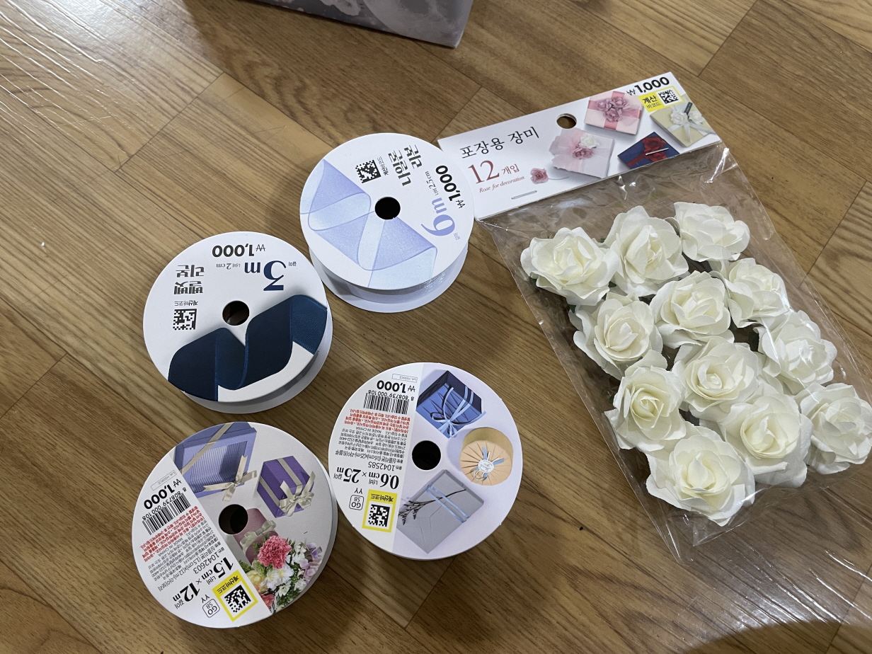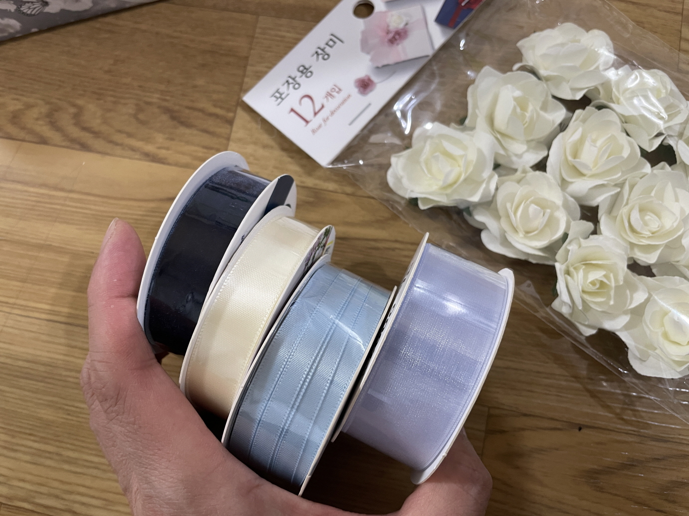 이렇게 구입해서 5천 원어치 사 왔어요. 리본 4 롤에 포인트용 장미 장식을 구입했습니다. 장미는 리본으로 접어서 포인트 장식을 하는데, 이런 장미 장식으로 해도 예쁠 것 같아요.