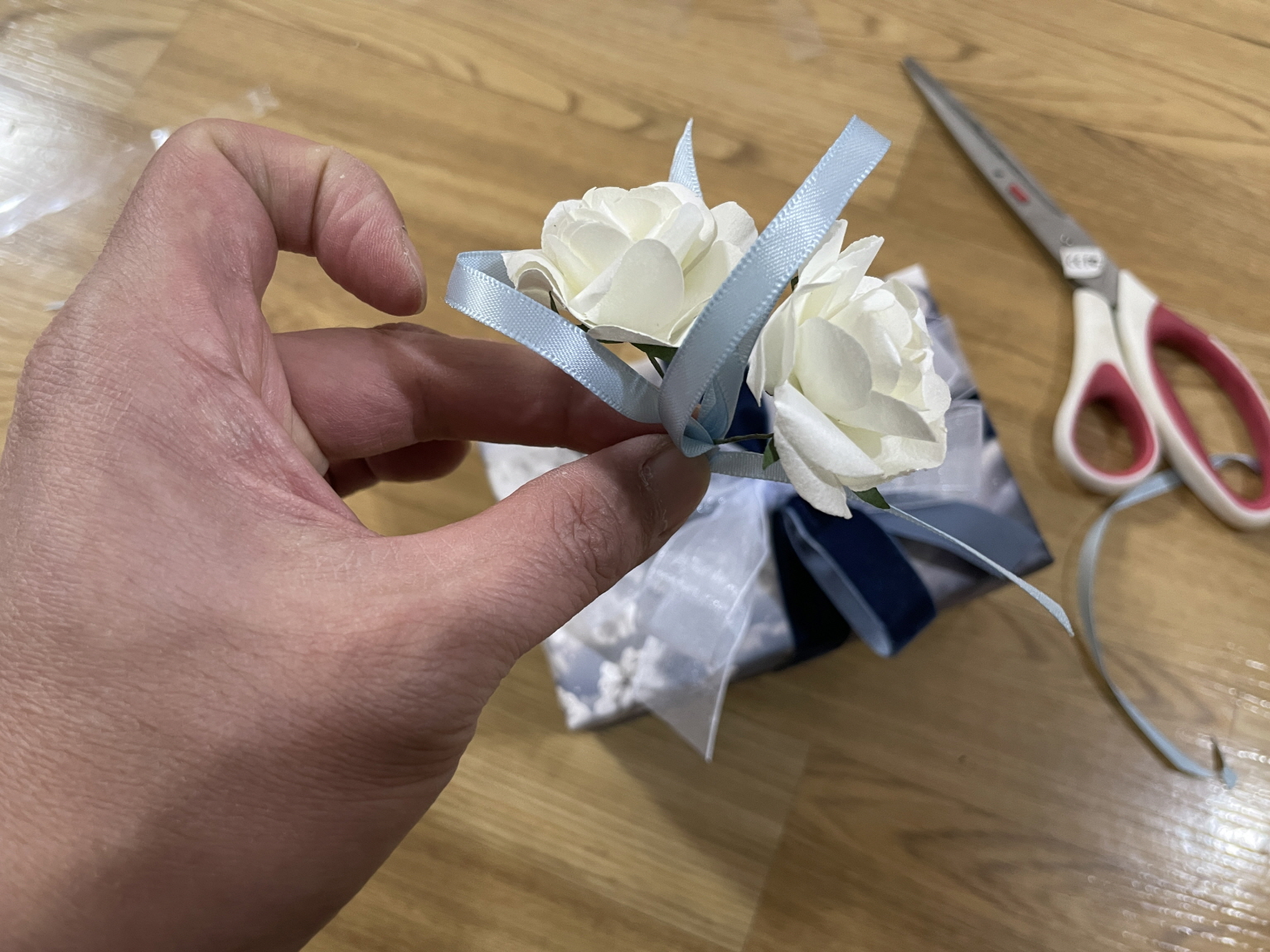 4 화려하게 추가로 포인트를 주려면 가운데 꽃 장식을 합니다. 폭 6mm의 얇은 리본으로 장미 주변을 둘러주고요. 장미 두 송이 정도 글루건을 이용하여 묶어놓은 리본 중앙에 붙여줍니다.