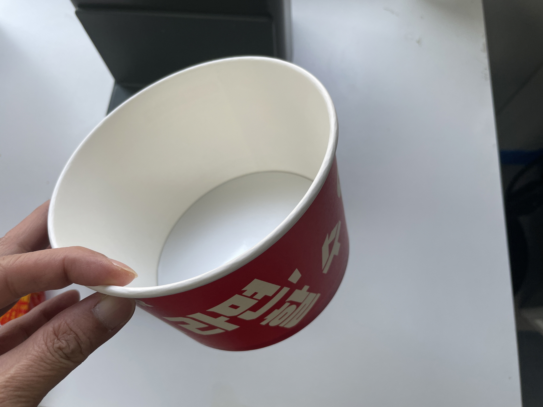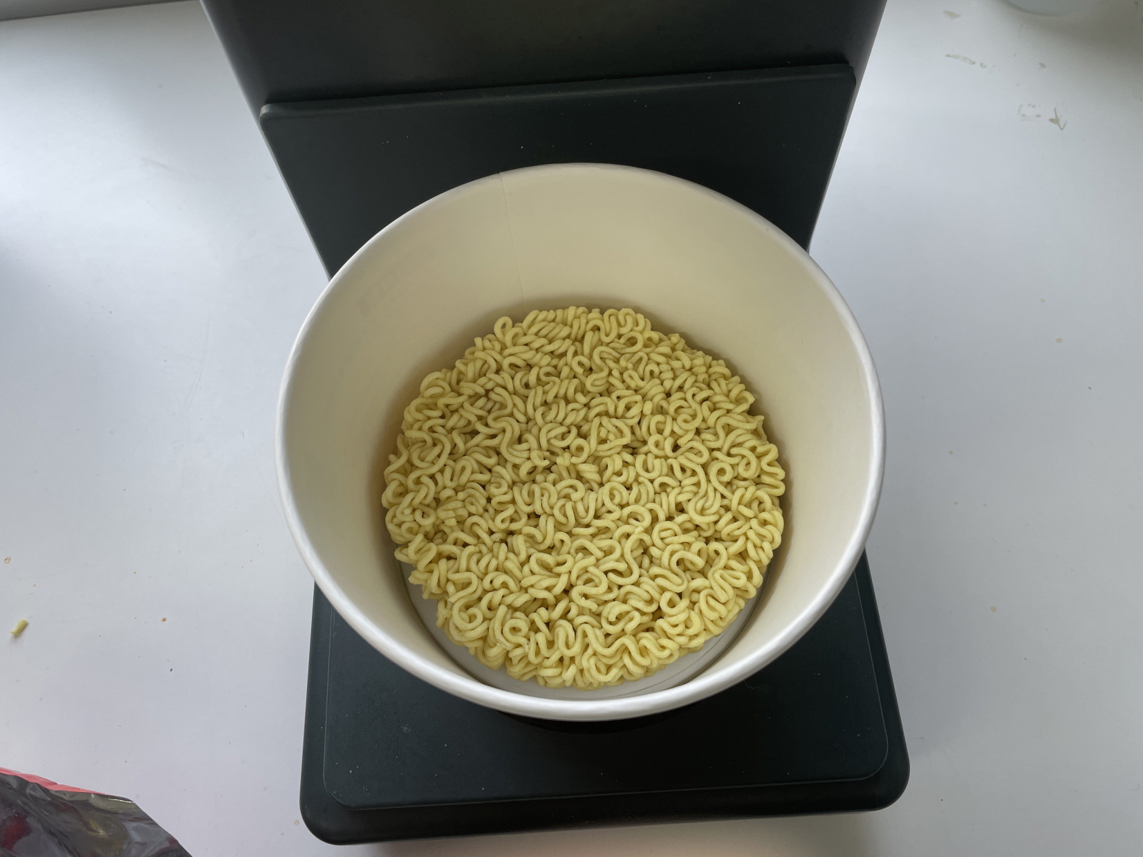 전용 종이컵에 라면과 스프를 넣습니다.