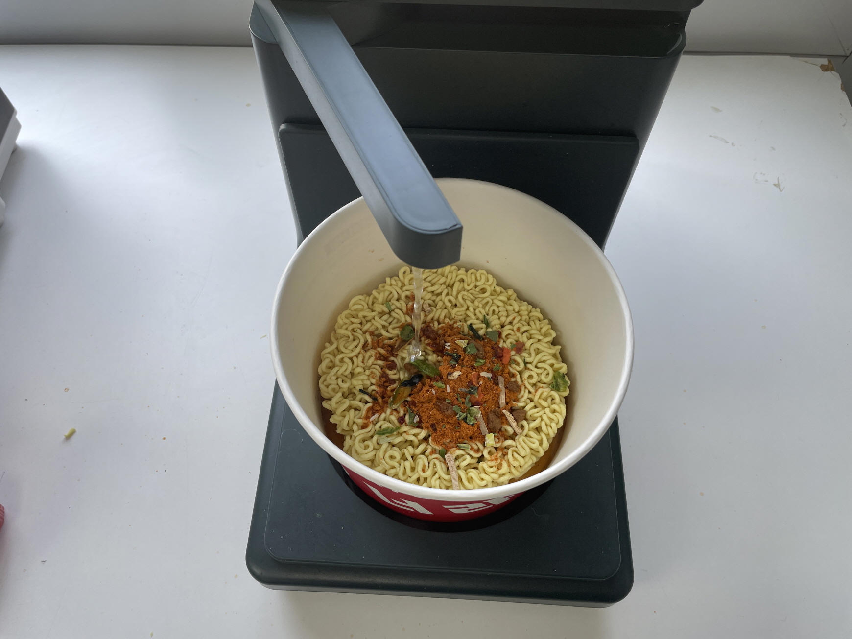라면 모드를 선택 (일반/짜장/통통) 합니다. 잠시 후 기계에서 물이 나오고 조리를 시작합니다.