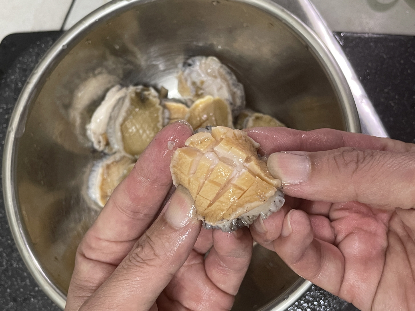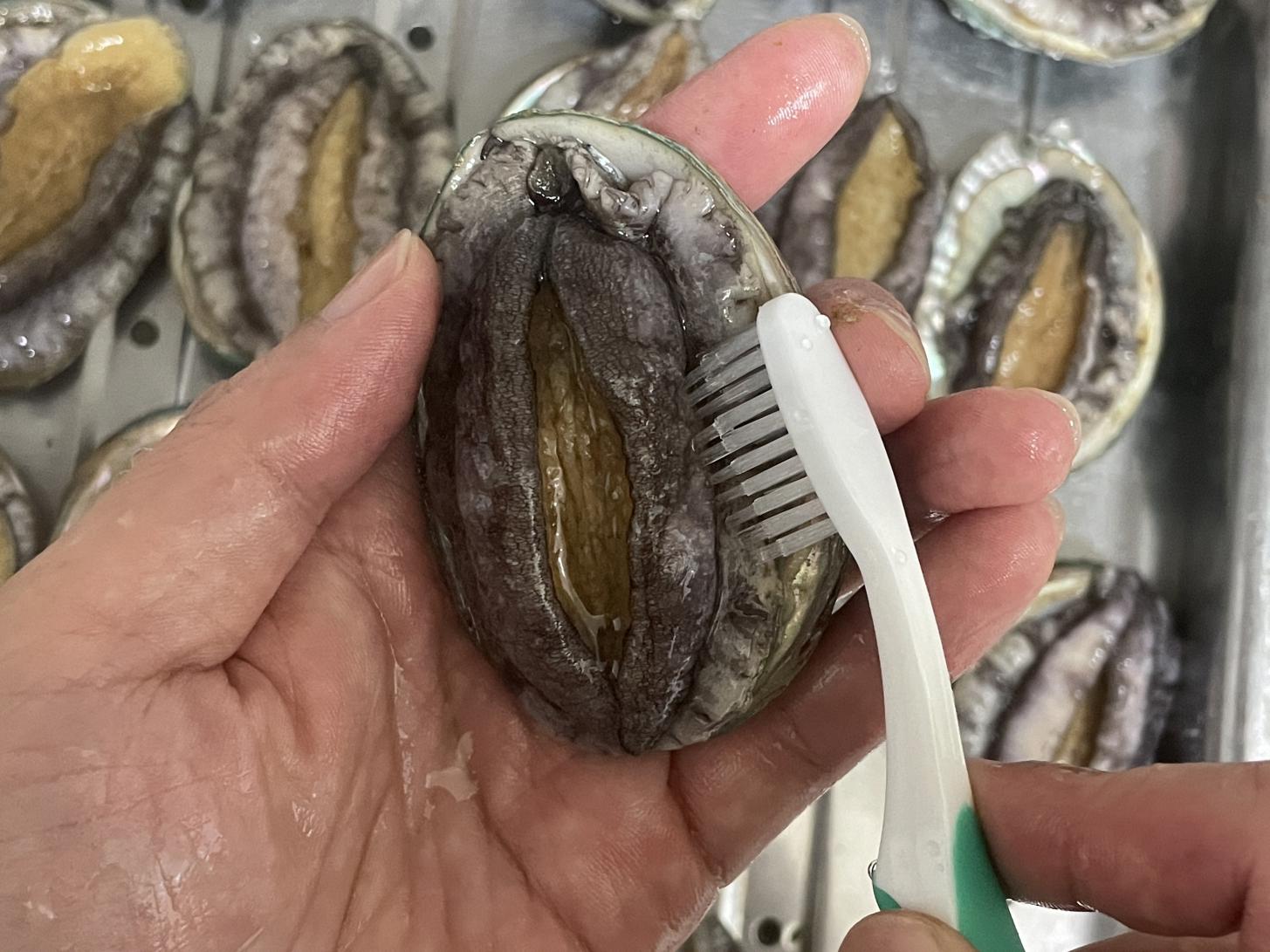 우선 전복의 이물질을 닦아야 해요. 살에 거뭇거뭇한 부분을 다 닦아야 하는데요. 별도의 솔이 없다면 깨끗한 칫솔로 닦아도 괜찮아요. 몇 번만 문질러도 흰 살이 드러납니다. 깨끗이 닦으려 하니까 닦는데 시간이 가장 많이 소요되네요.