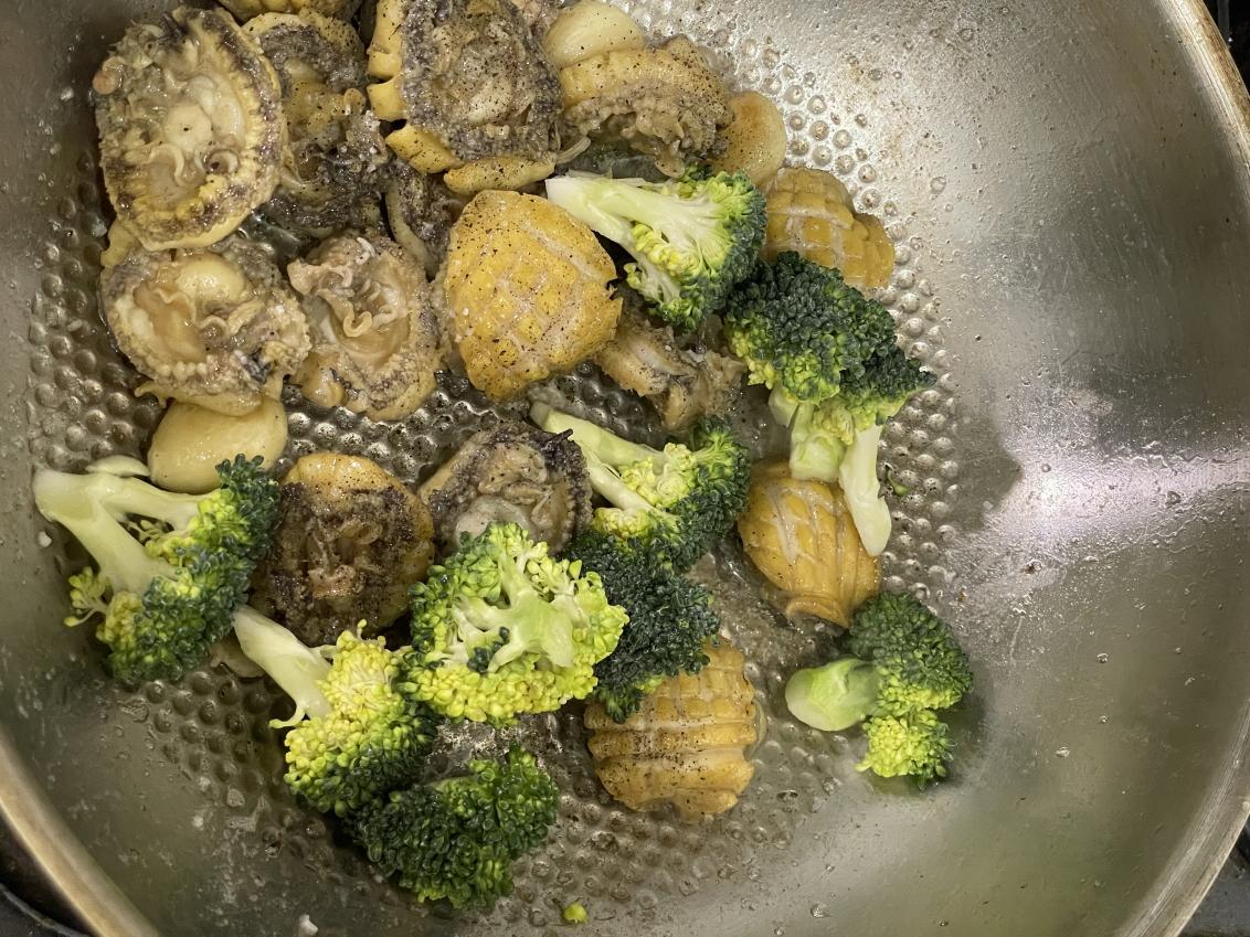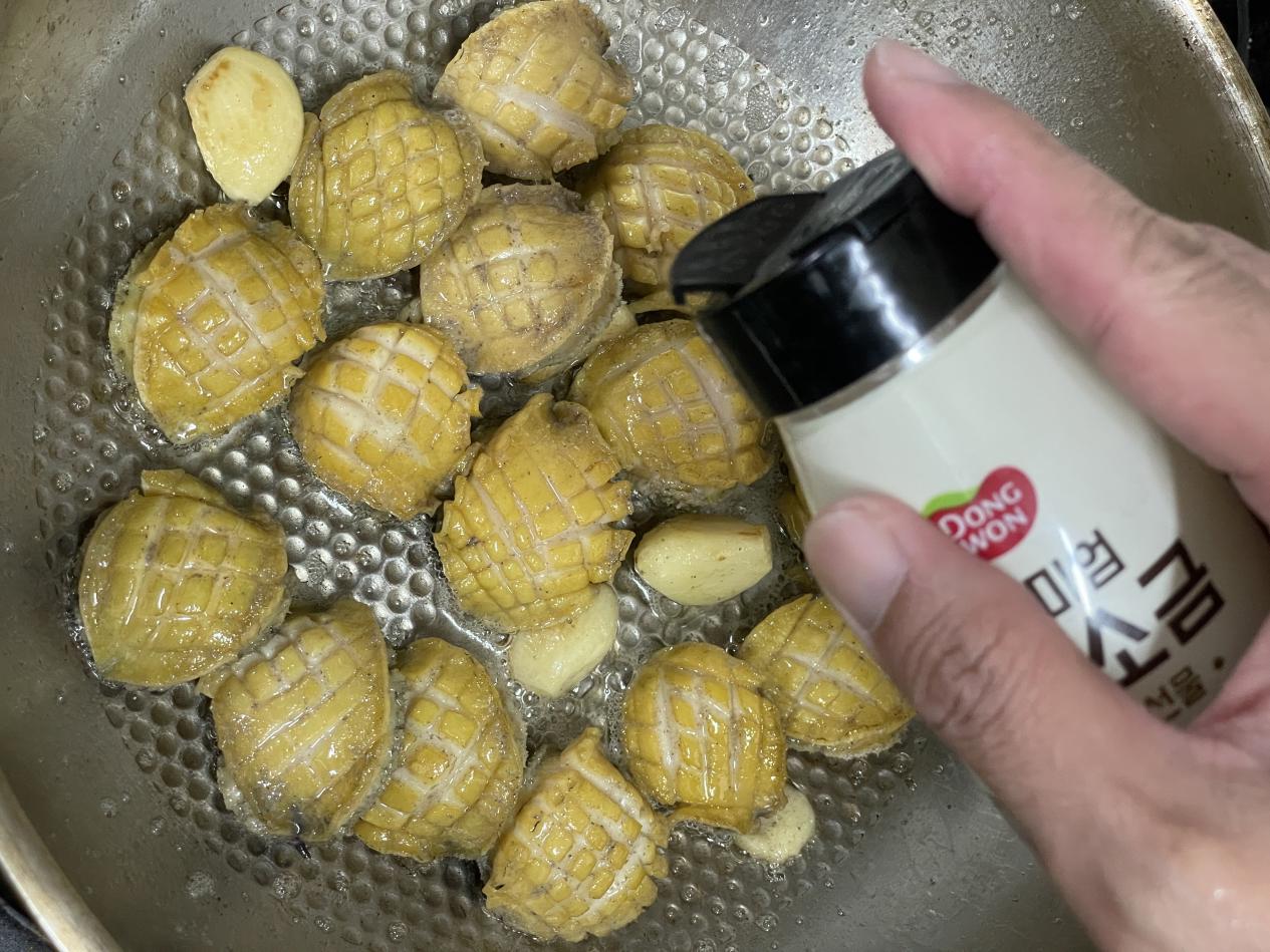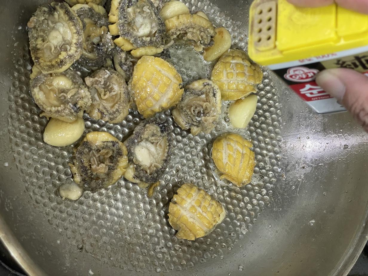 마늘이 노릇노릇해지면 손질된 전복을 넣어 익힙니다. 센 불에 1분 정도 익힙니다.