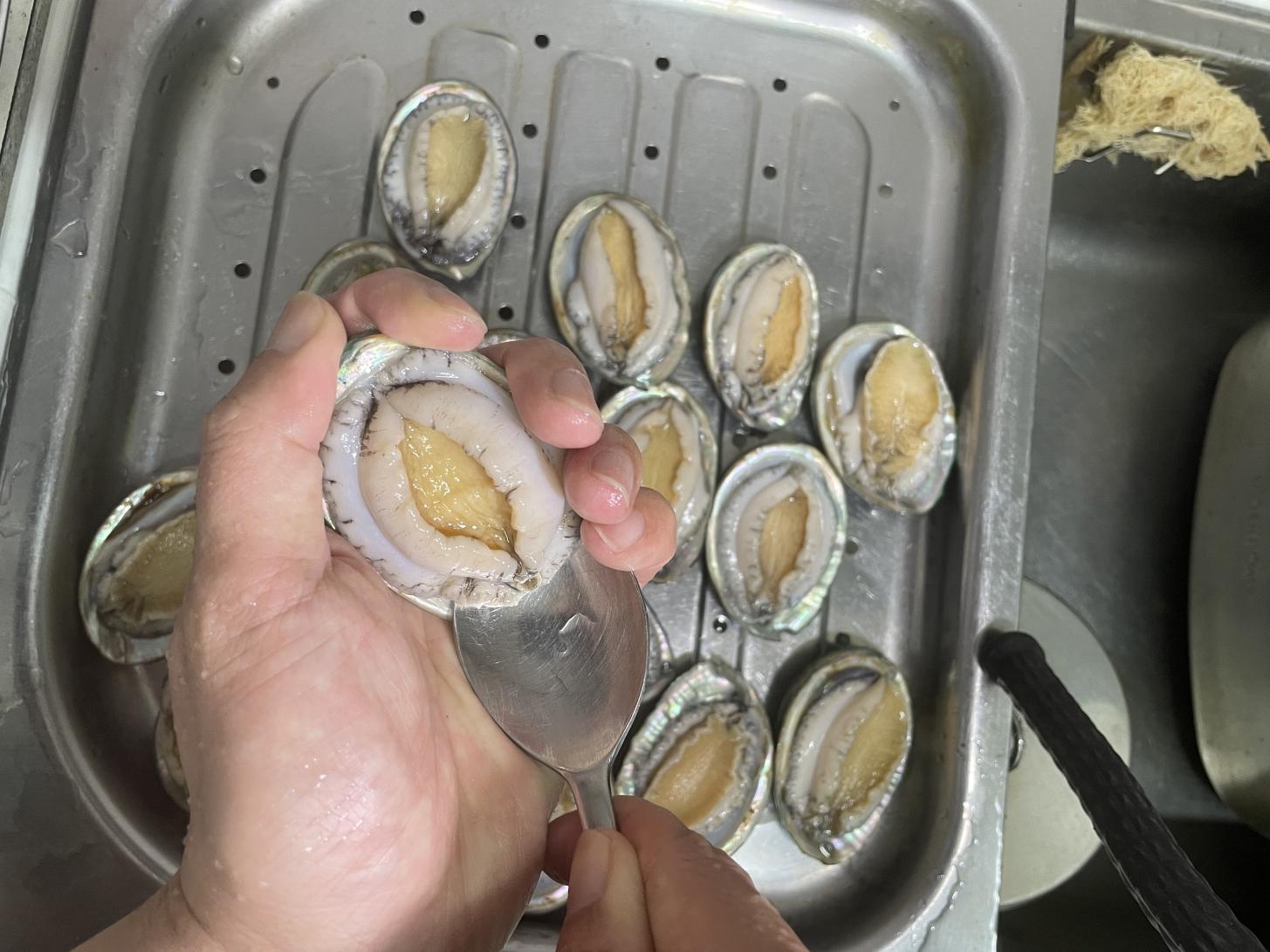 그다음으로는 껍데기와 분리를 해야 하는데요. 숟가락으로 이빨 아래 부분을 밀어 넣으면 분리됩니다. 조개처럼 관자 같은 게 껍데기와 붙어있어요. 그 부분만 숟가락으로 밀어서 잘라내면 돼요. 전복 껍데기에 손 다치지 않도록 조심하세요.