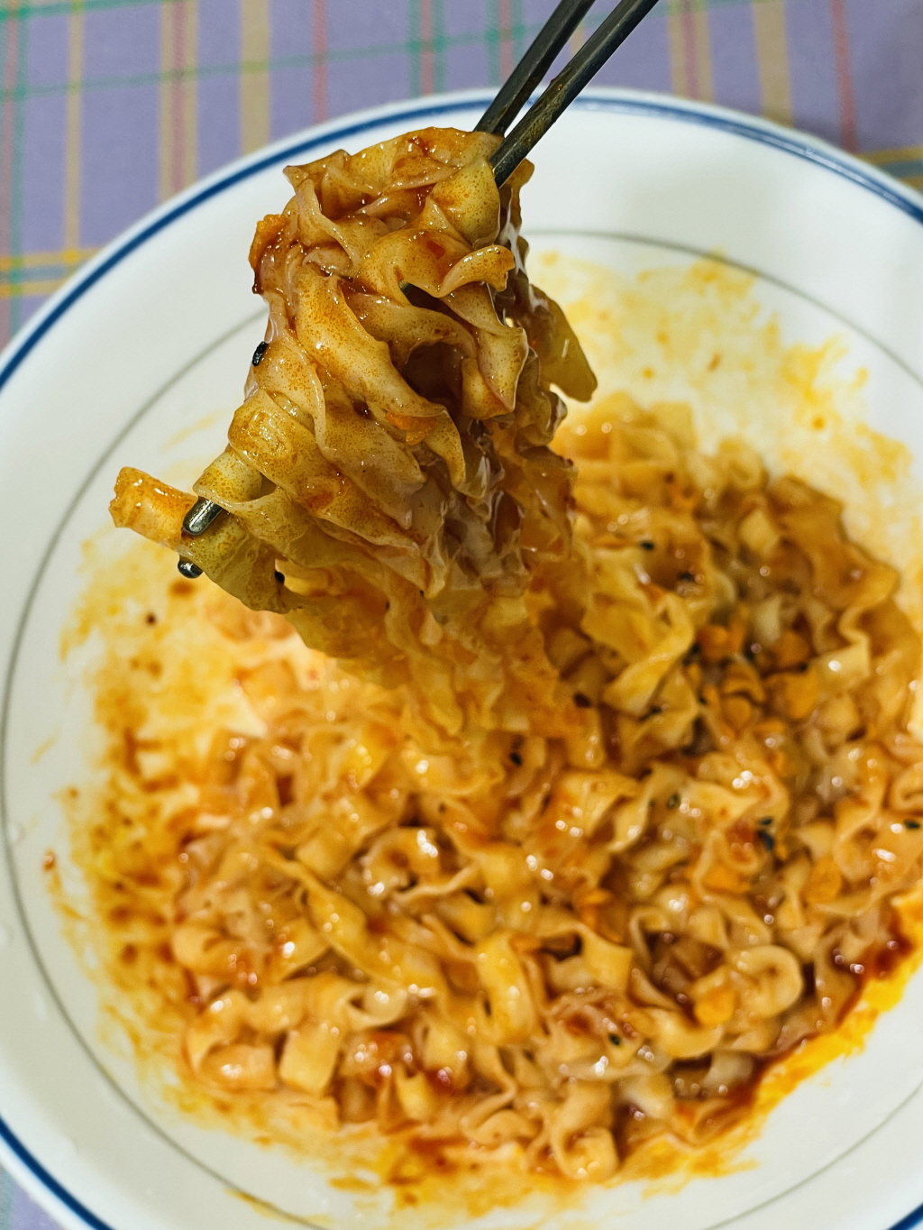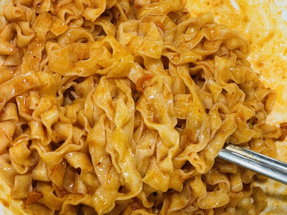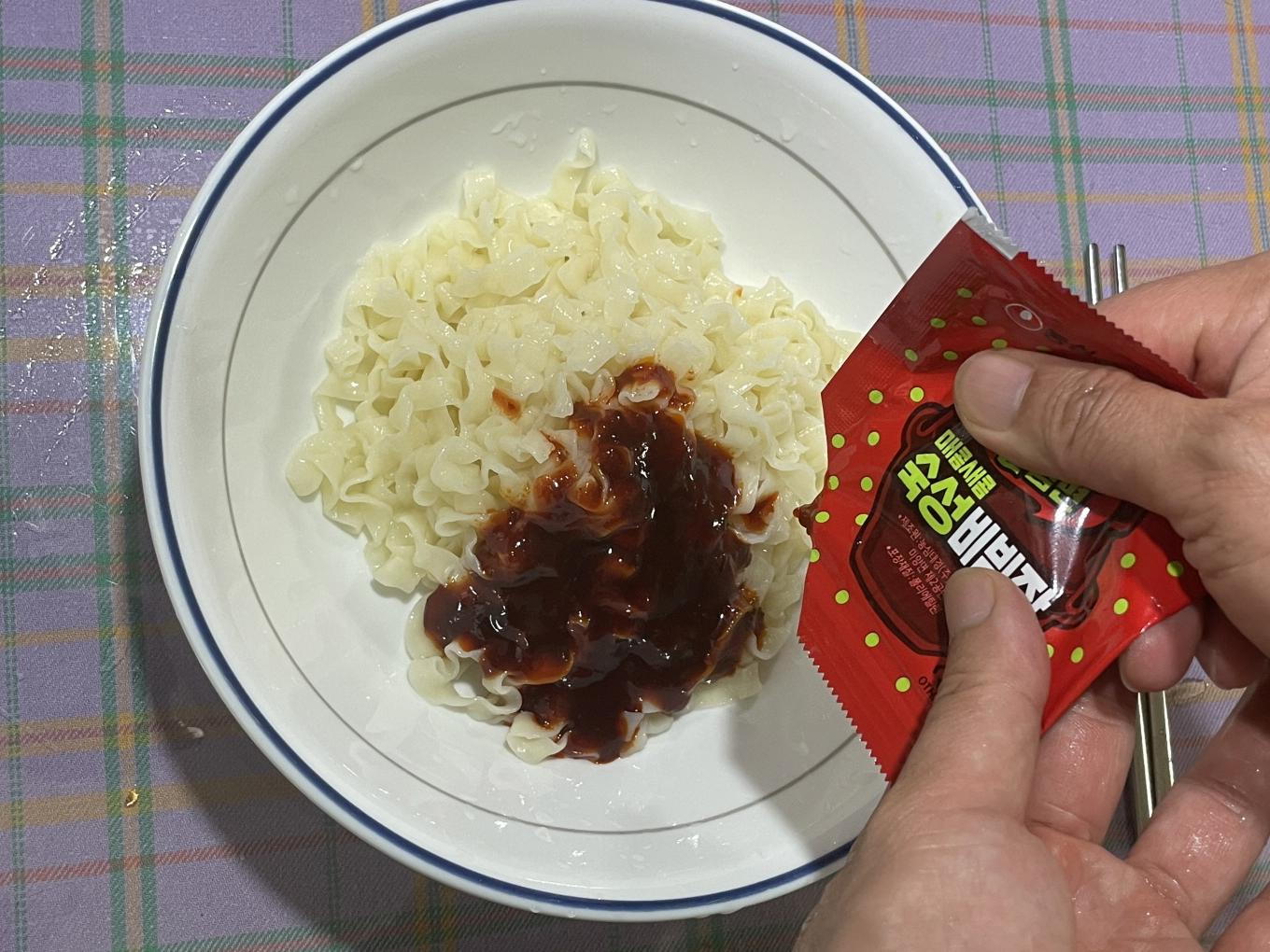 일반 비빔면보다 넓은 면발이 비빔장을 더 많이 면과 어러러져서 매콤새콤한 맛이 더 강하게 느껴지네요. 고기 먹을때 같이 먹어도 좋을 것같은 맛입니다.