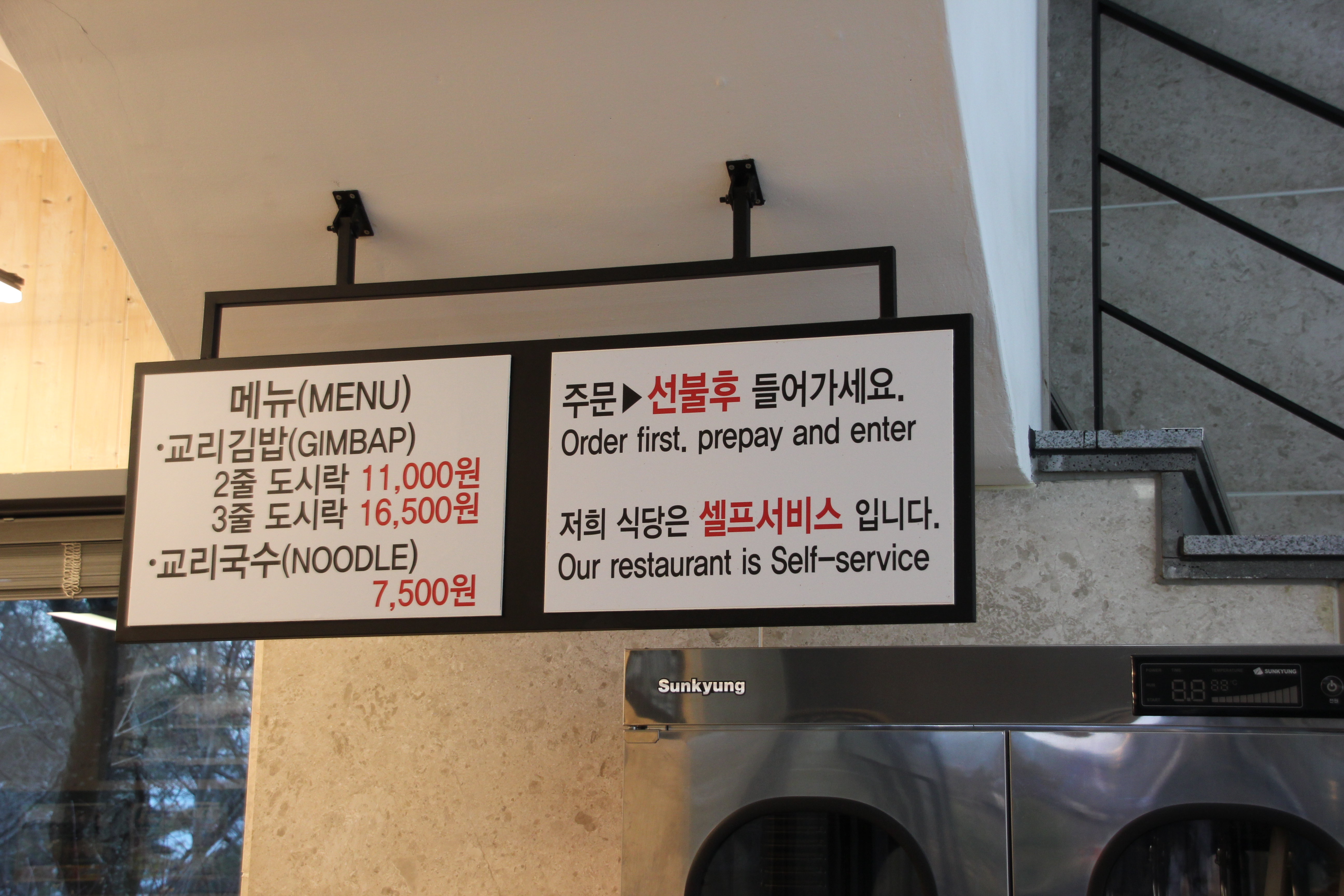 김밥 만 주문할 때는 포장만 가능하고, 매장에서 먹으려면 국수를 주문해야 한다고 합니다.