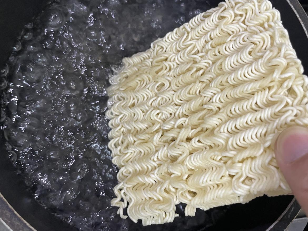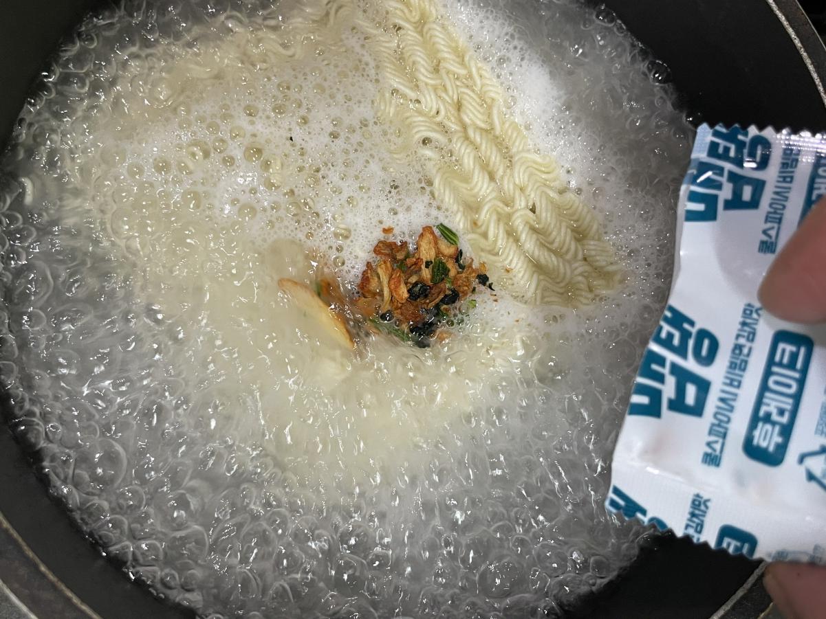 끓는물 600ml에 면과 후레이크 스프를 넣고 3분간 더 끓입니다.