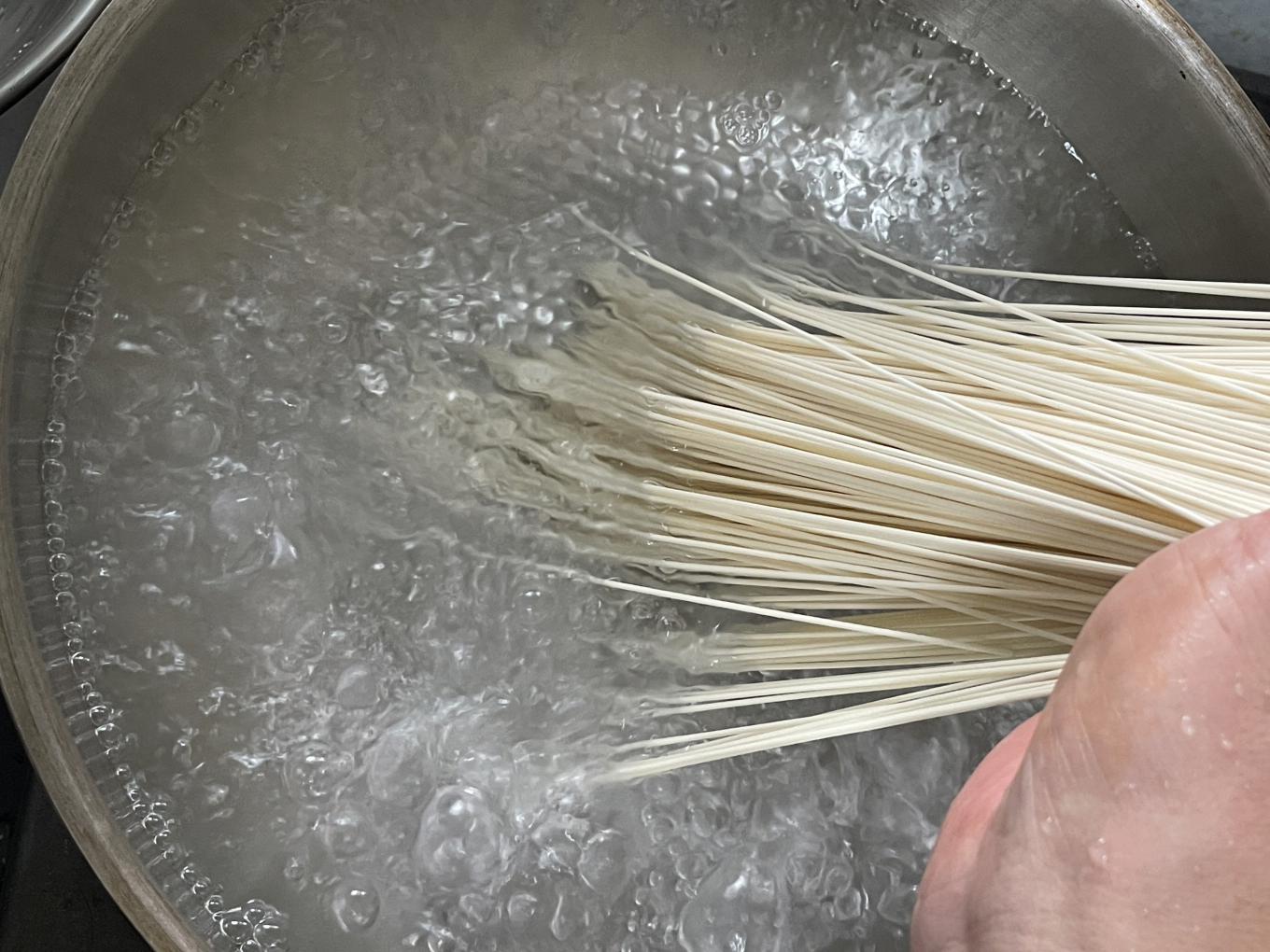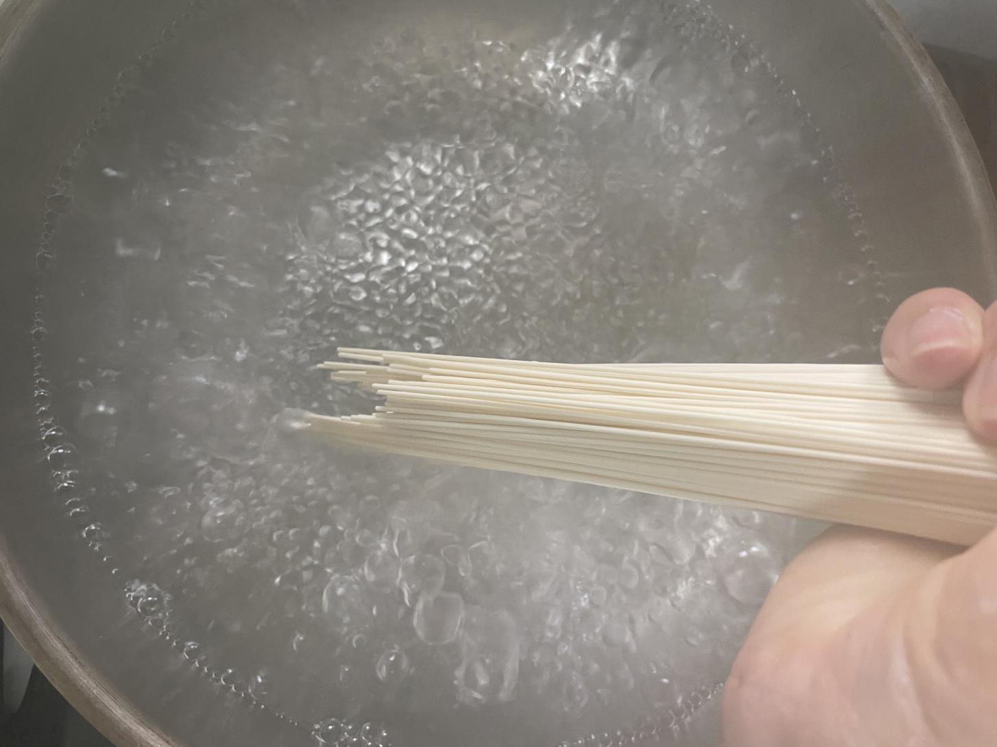 충분한 양의 물을 끓이고 소면을 삶습니다. 3분 정도 끓이면 다 익어요. 제품에 따라 익히는 시간은 조금씩 달라요. 물이 너무 적거나 냄비가 작으면 면이 익으면서 붙을 수 있어요. 면이 붙지 않도록 끓이는 동안 저어줍니다.