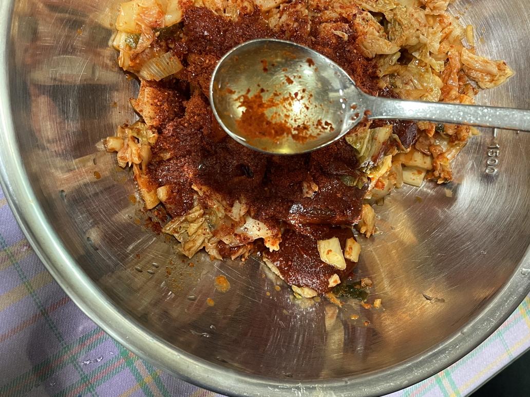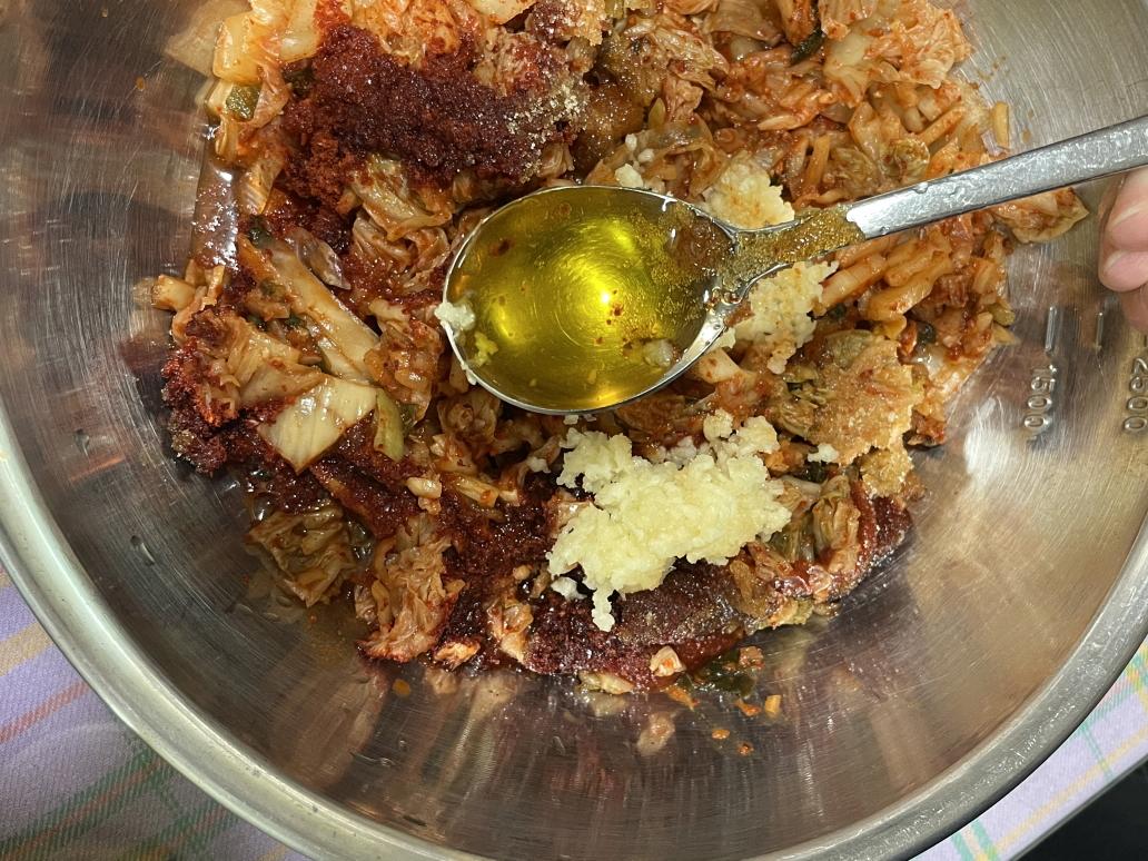 김치에 양념재료를 모두 넣어 비벼서 김치 양념장을 만들어 준비합니다.