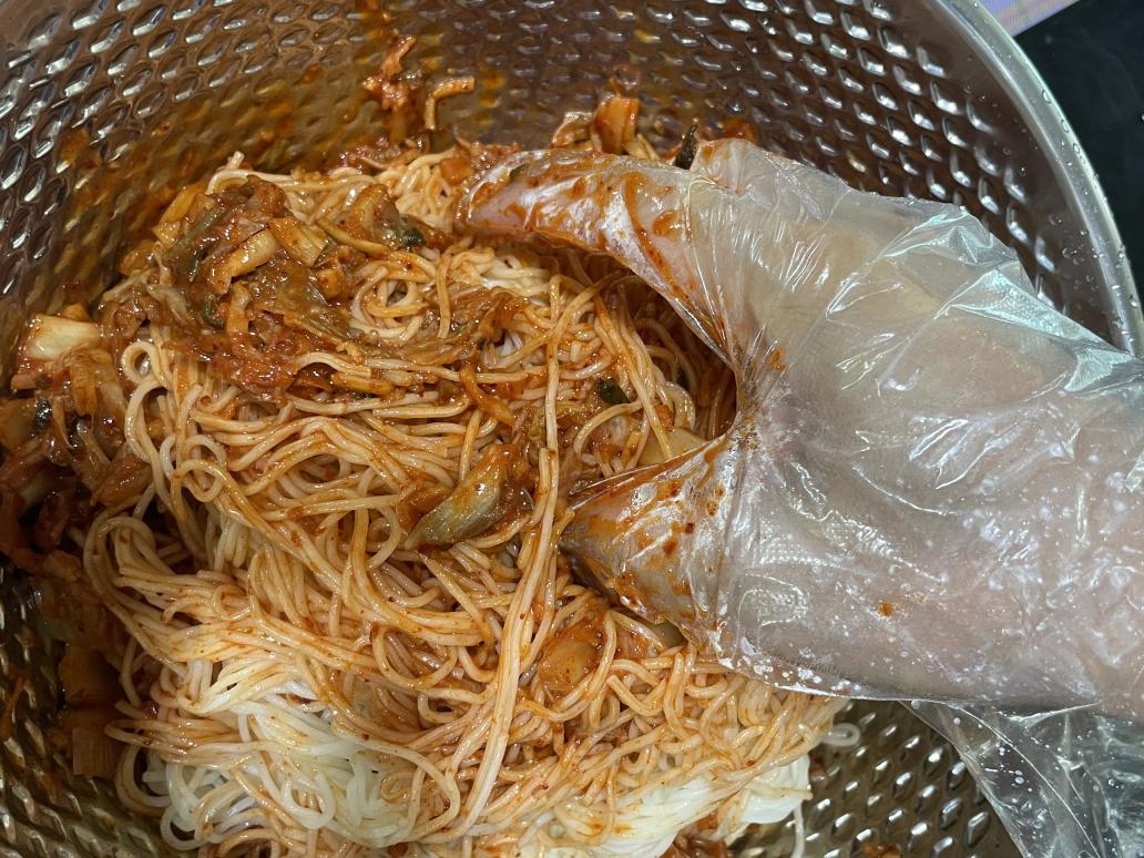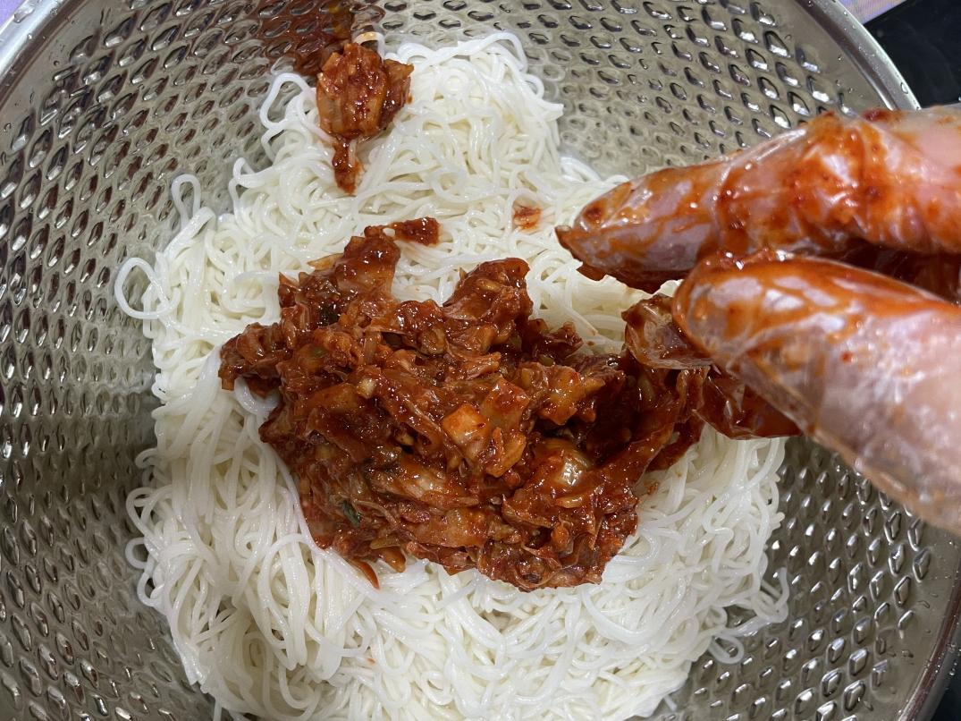 소면에 김치양념장을 넣고 비비기