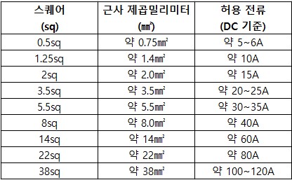 - 스퀘어(sq) 단위를 사용하는 전선은 사양서를 통해 실제 굵기와 허용 전류를 확인하는 것이 안전합니다.