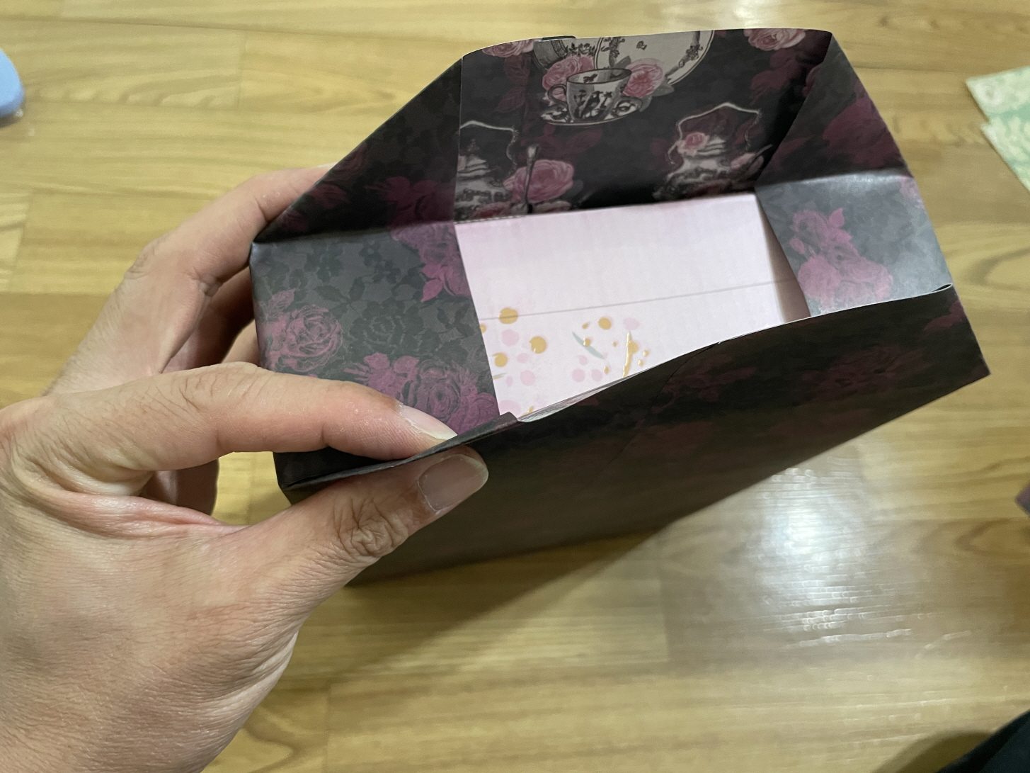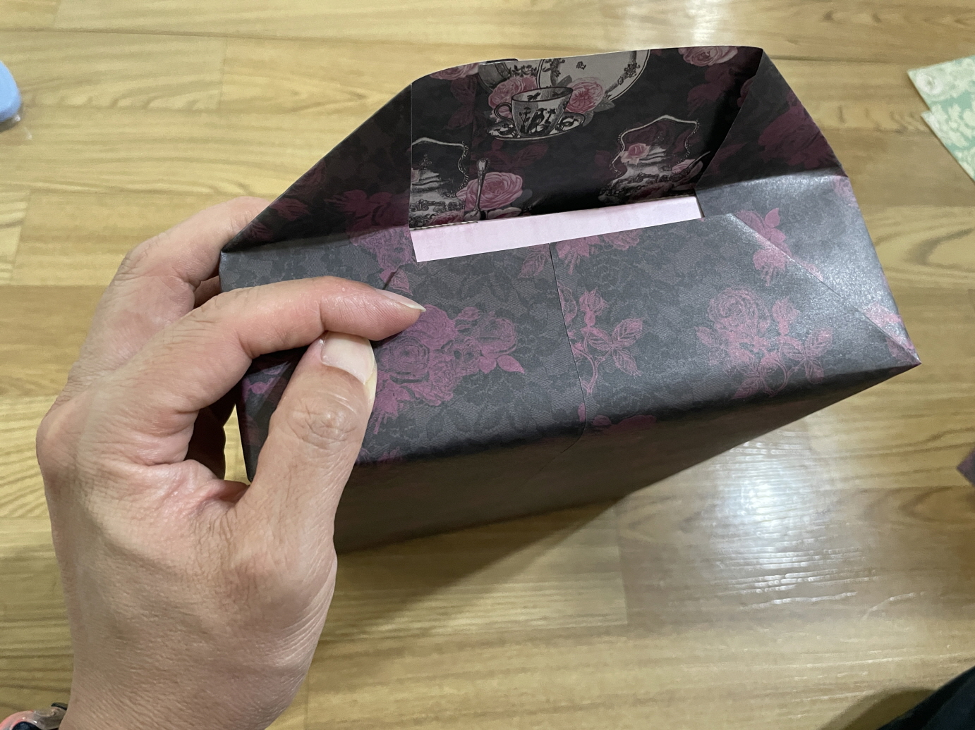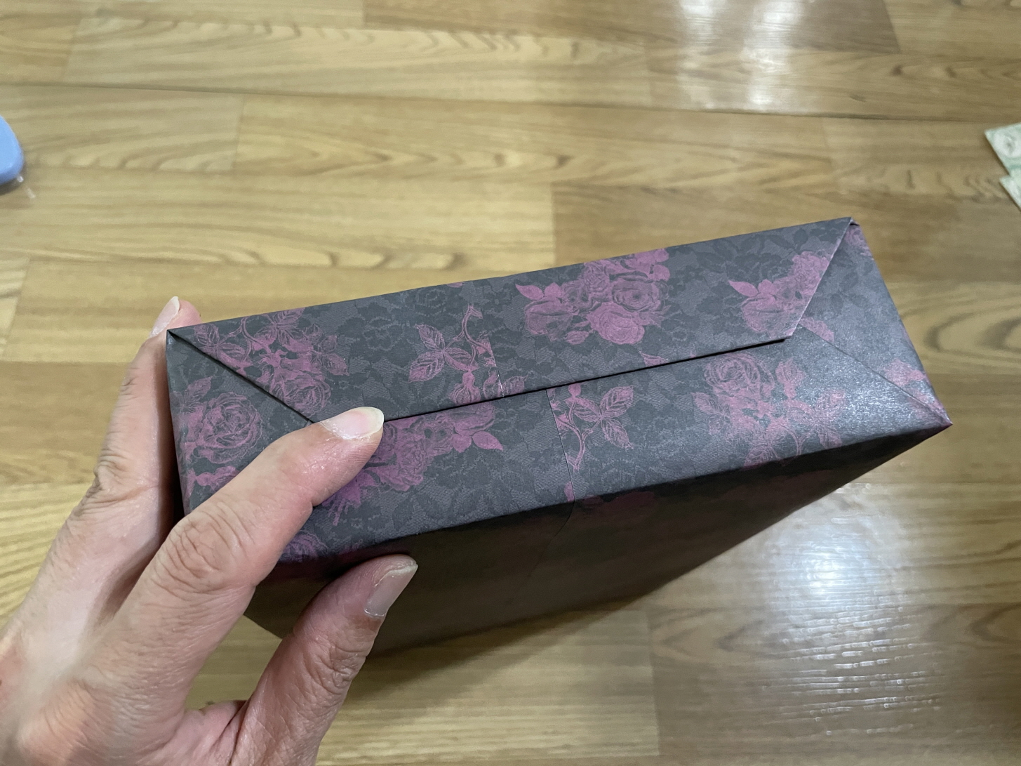 선물은 조립식 뮤직 박스입니다. 이 제품은 각진 박스모양의 선물이기 때문에 포장지로 먼저 포장합니다.