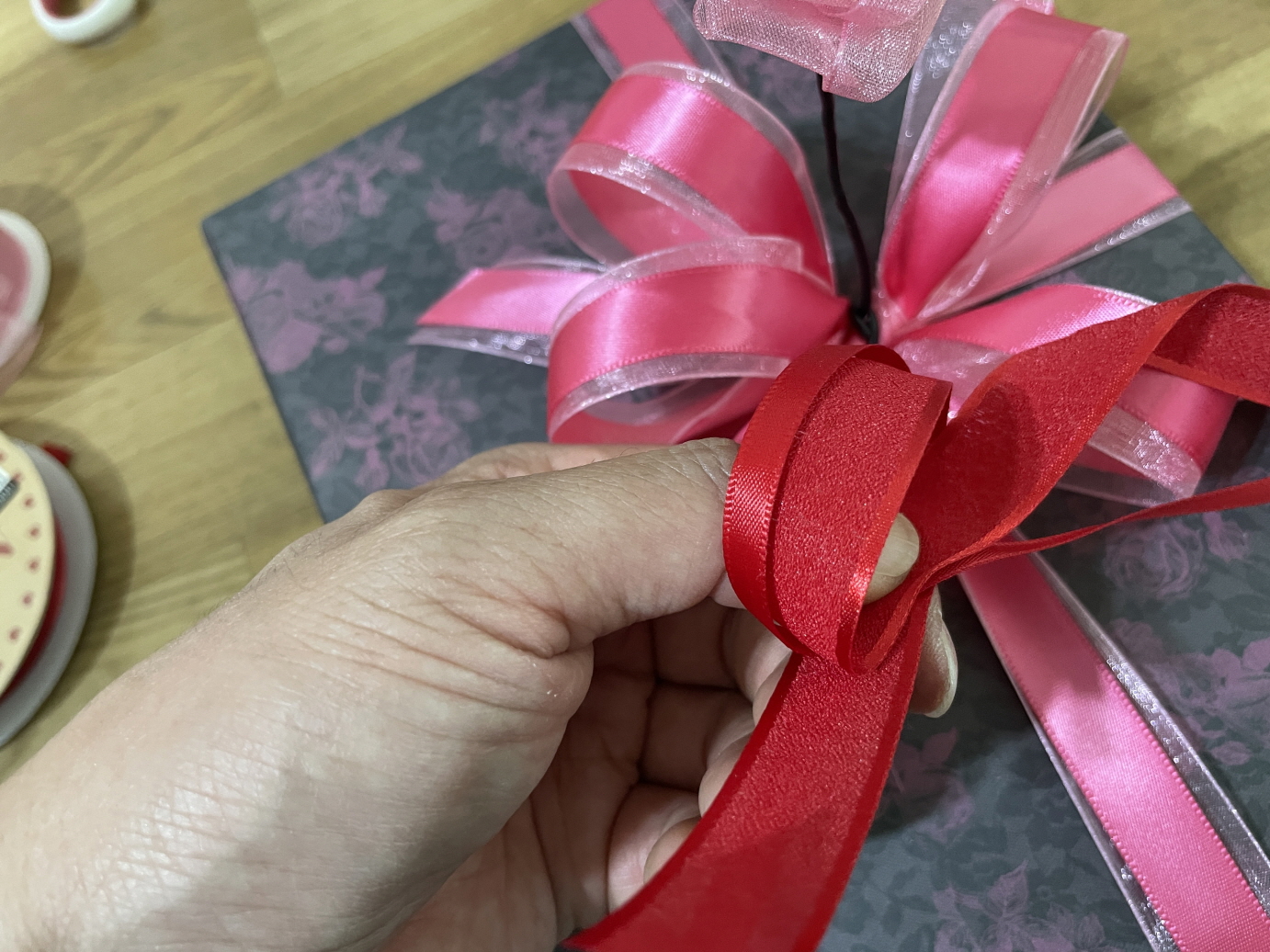 장미 한 송이만 하면 허전하니까 빨간색 리본으로 장미 주변을 추가로 장식해 줍니다.