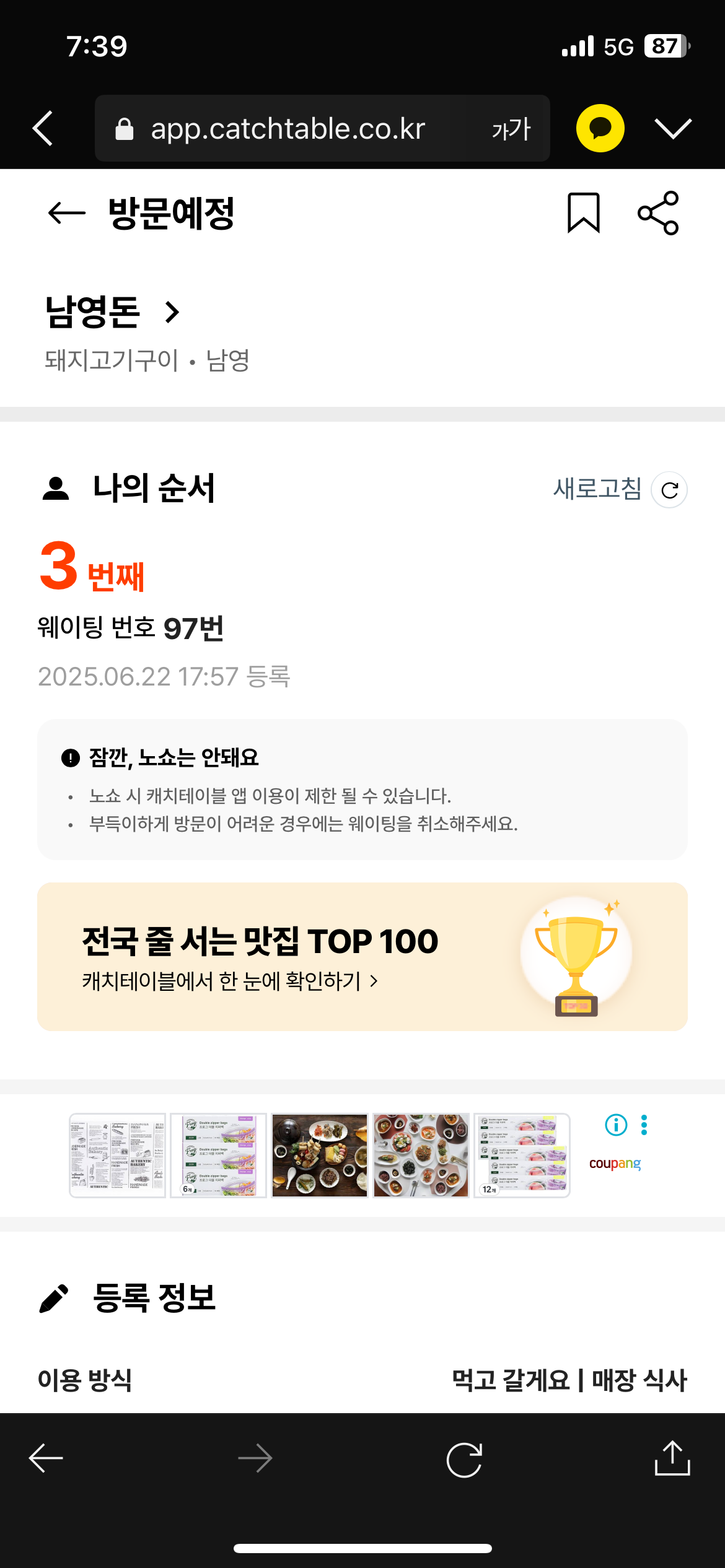 아래 캐치테이블 어플화면을 보시면 오후 6시쯤 웨이팅 등록을 하고 7시40분정도에 3번째 대기입니다. 그러니까 1시간 40분정도 기다린거네요. 참고하세요.