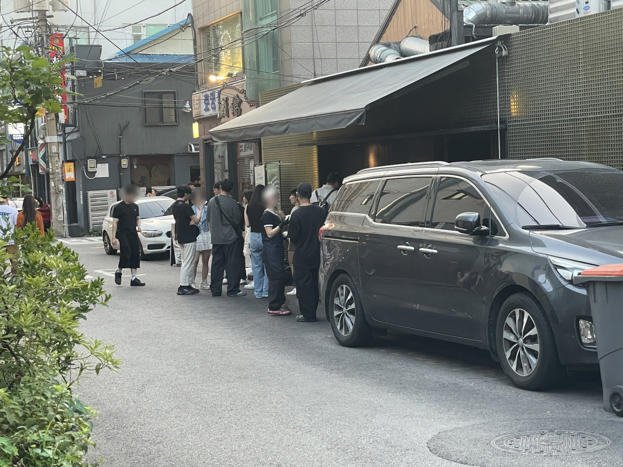 식당 앞에 기다리는 사람들이 있는데요. 이 사람들은 대기가 얼마 안 남은 사람들이 와서 기다리는 거예요. 이미 많은 사람들이 웨이팅 등록을 해놓고 근처에서 다른 거 하면서 기다리는 겁니다.