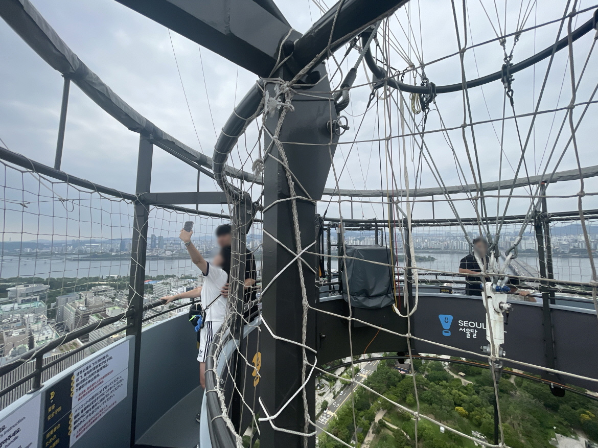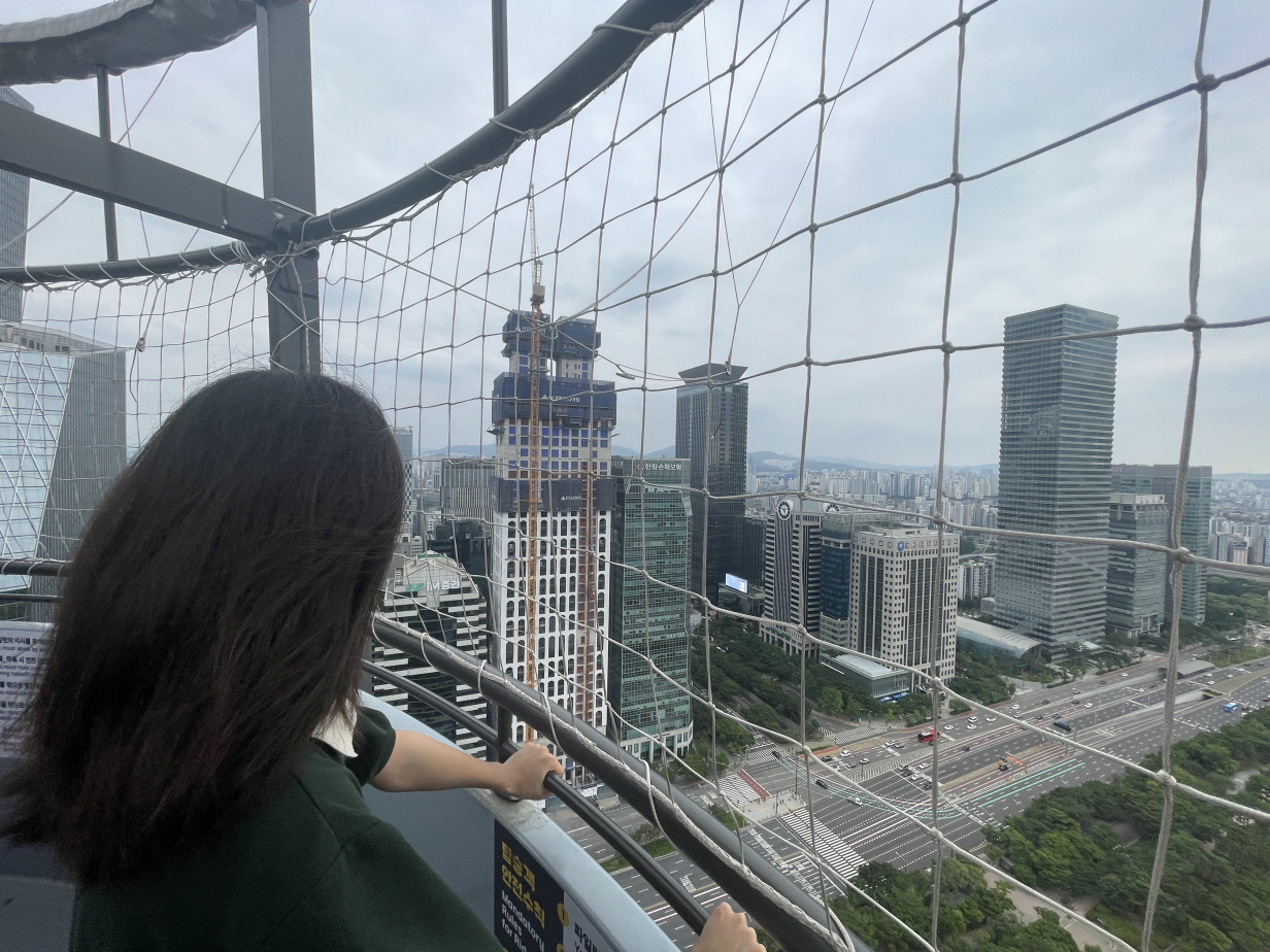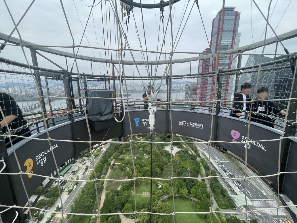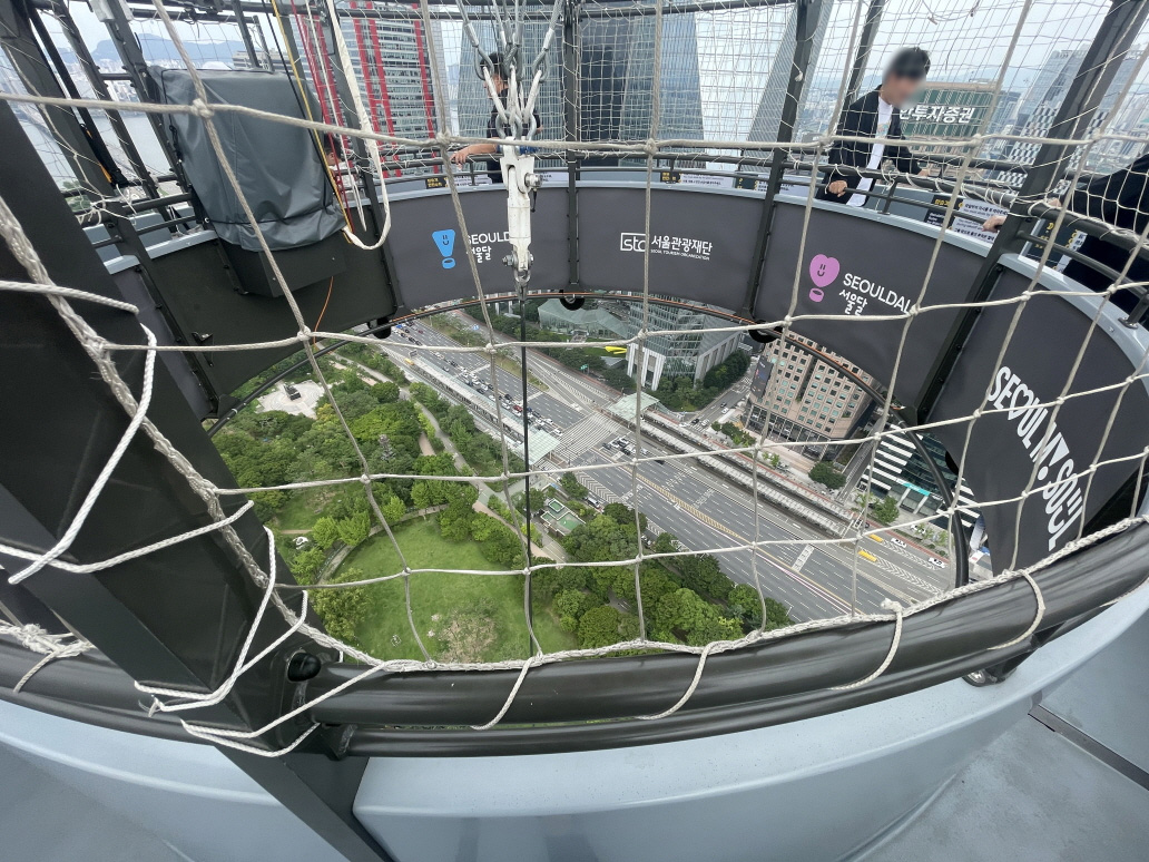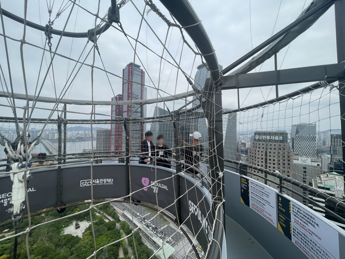 서울달의 비행높이는 130m입니다. 개인마다 느끼는 높이는 다르지만 고소공포증이 있다면 조심해야 하고요. 40층 건물 옥상에서 내려다보는 높이와 비슷해요. 아이들도 타고, 재미있다고 할 정도입니다. 무섭다고 생각하면 무섭고, ‘별거 아니야’라고 생각하면 재미있습니다. 생각하기 나름이에요. 45층 고층아파트 살면서 이거 타면 무섭다고 하는 사람도 있거든요. 대략 옆에 보이는 한화손해보험 건물 높이와 비슷하다고 생각하면 됩니다.