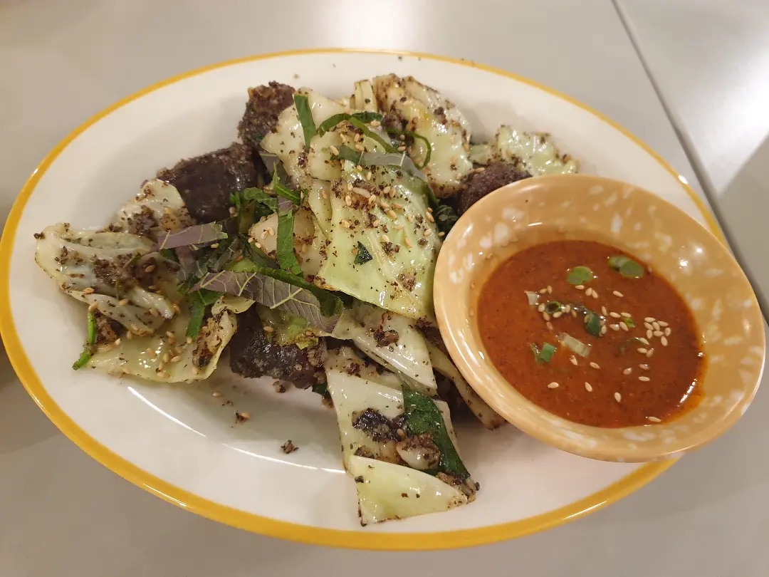 백순대볶음을 소스에 찍어 먹는 건데요.