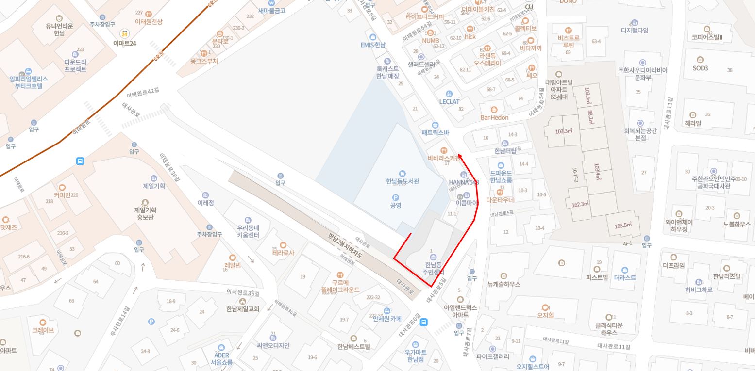 가까운 곳에 한남동공영주차장을 이용하면 마음 편하게 주차할 수 있어요.