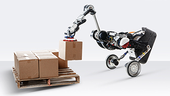 주변 환경을 인식할 수 있는 센서와 카메라를 이용해 상자를 식별하고 크고 긴 팔을 이용해 상자를 들어 컨베이어에 올려놓는 동작을 합니다.