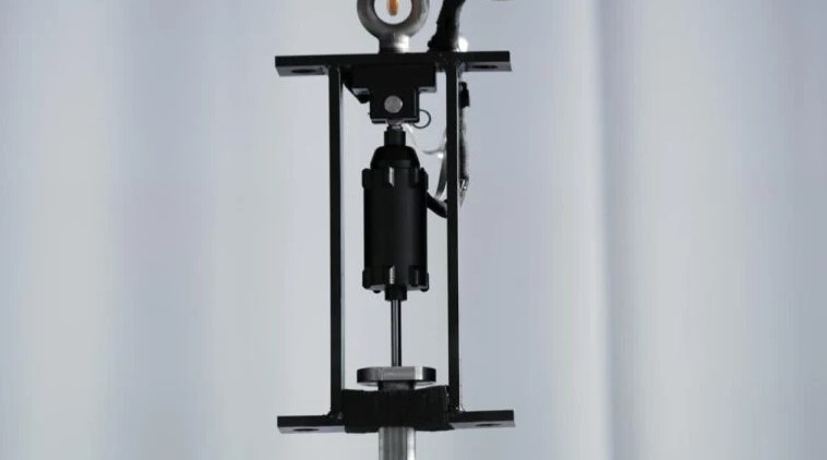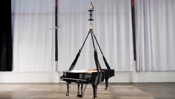 직접 개발한 리니어 액추에이터를 500kg의 그랜드피아노에 매달아 공개하는 장면