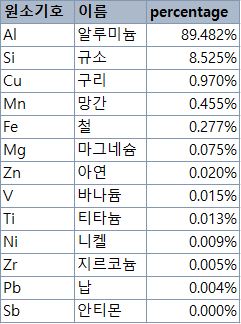 주성분은 알루미늄 89.5%, 실리콘(규소) 8.5%로 알루미늄-실리콘 합금이라고 볼 수 있습니다.