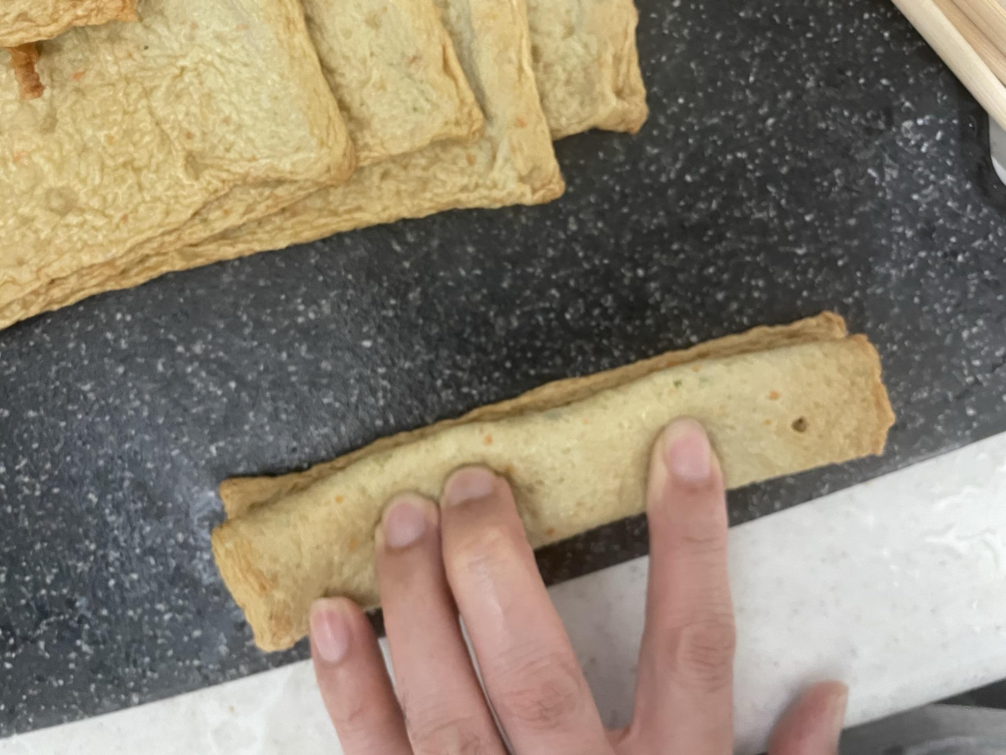 2. 사각 어묵을 길게 3번 접습니다.