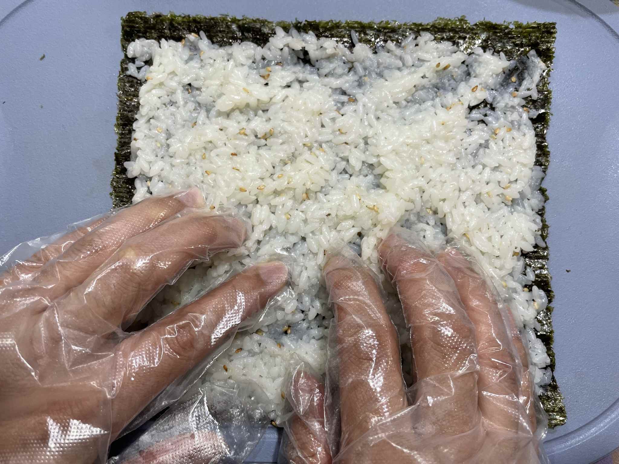 김에 밥을 골고루 바릅니다. 어느 한쪽은 밥이 많고 어느 쪽은 적으면 안 돼요.