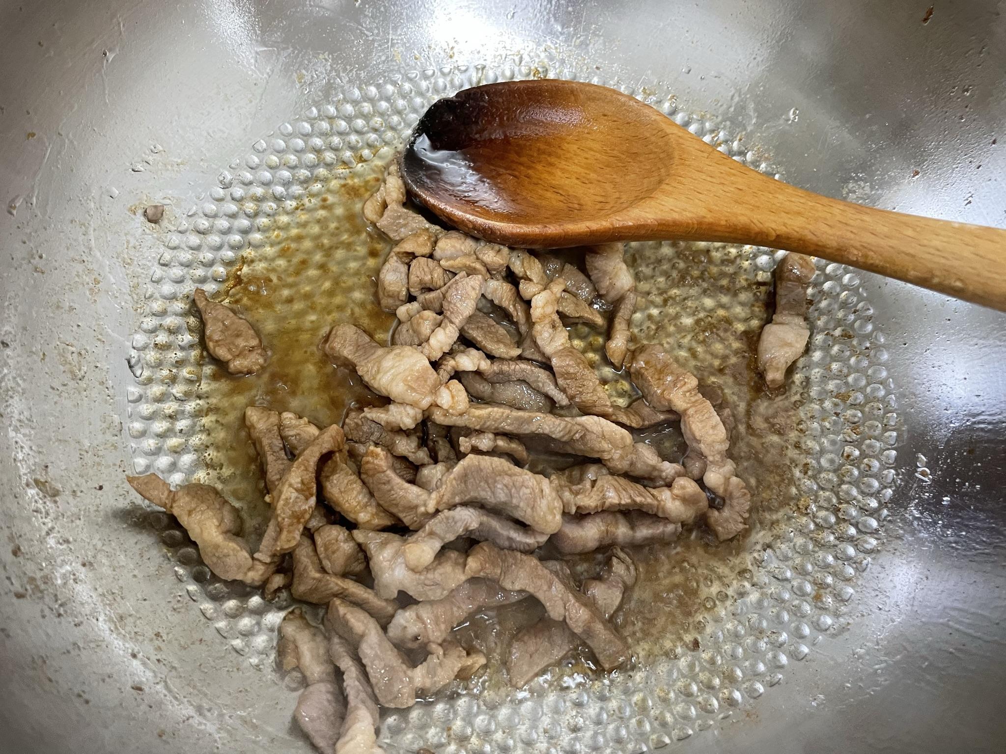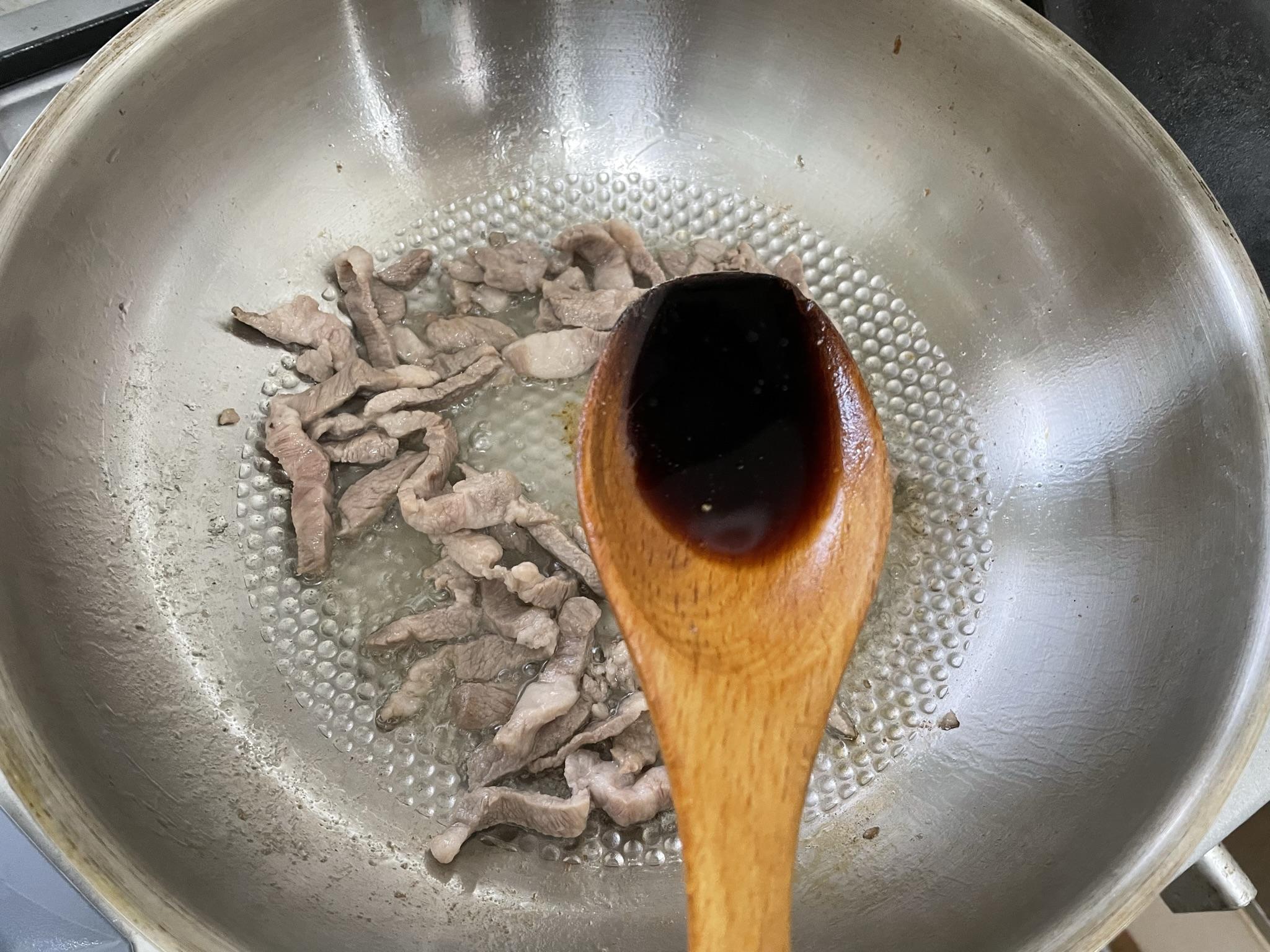 2. 먼저 식용유에 돼지고기를 볶은 후 간장으로 돼지고기 간을 해줘요. (돼지고기는 목살 준비했어요. 돼지고기는 다른 부위로 해도 괜찮아요)