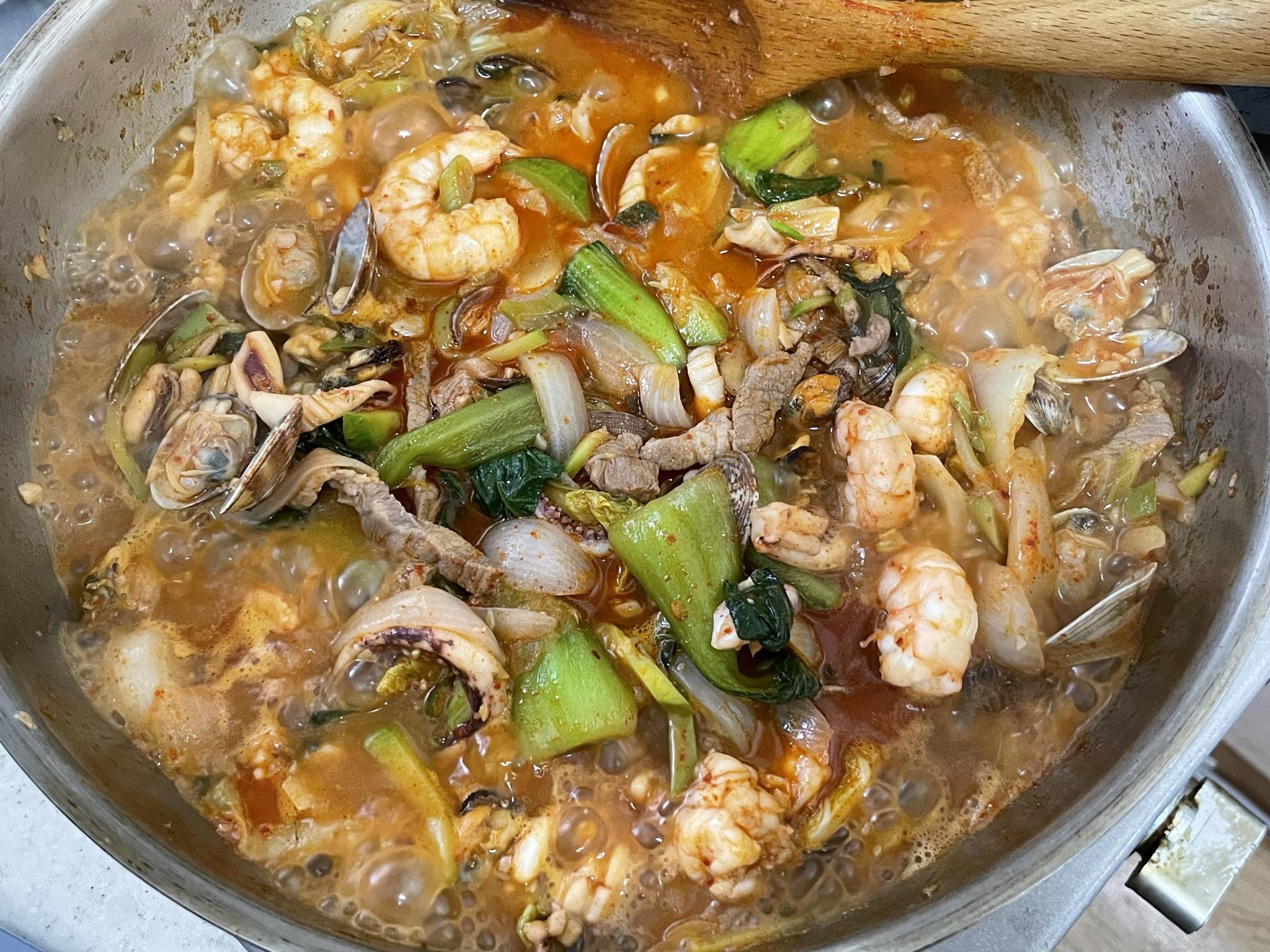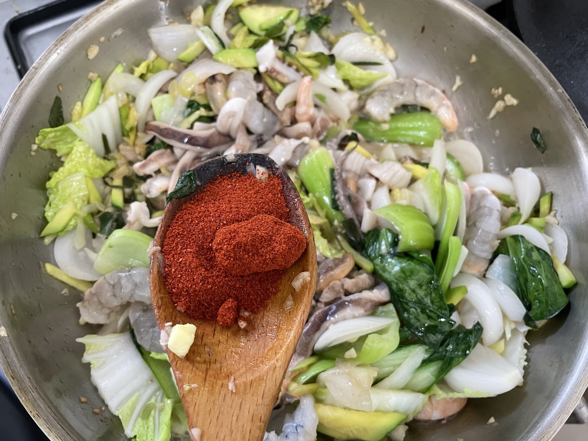 6. 해물을 넣고 볶다가 고춧가루 넣고 볶아요.
