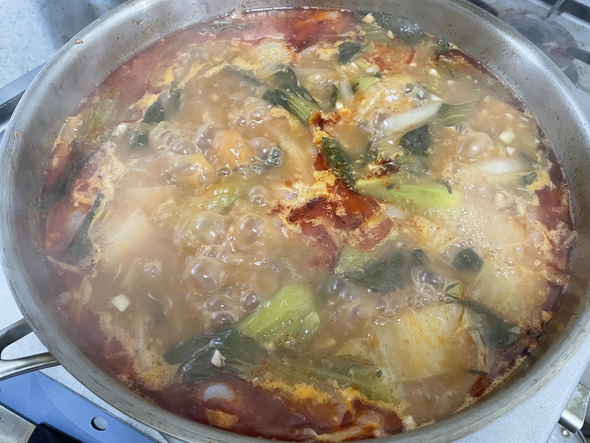 8. 치킨파우더와 후춧가루 넣고 끓이면 짬뽕 국물 완성입니다.