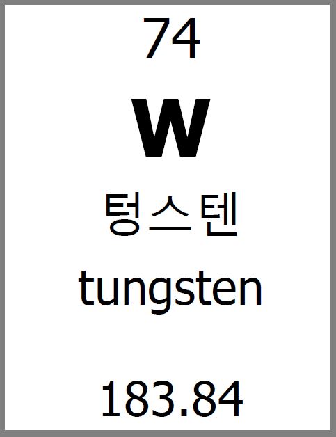 텅스텐은 스웨덴어로 ‘무거운(tung)돌(sten)’이라는 뜻입니다. 다른 뜻으로 Wolfram(볼프람)'이라고 부르기도 하였습니다.
