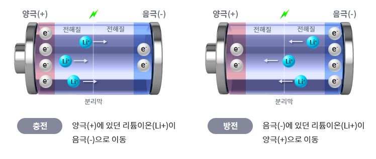 방전- 음극재에 있던 리튬이온이 양극재로 이동할 때 에너지 발생