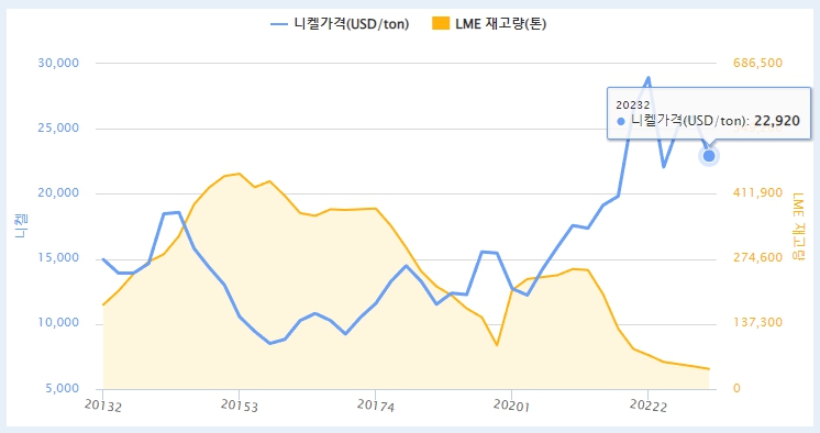 리튬과 마찬가지로 최근 니켈 가격도 떨어지고 있는데요.